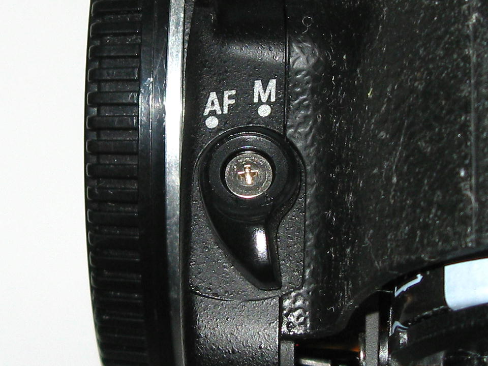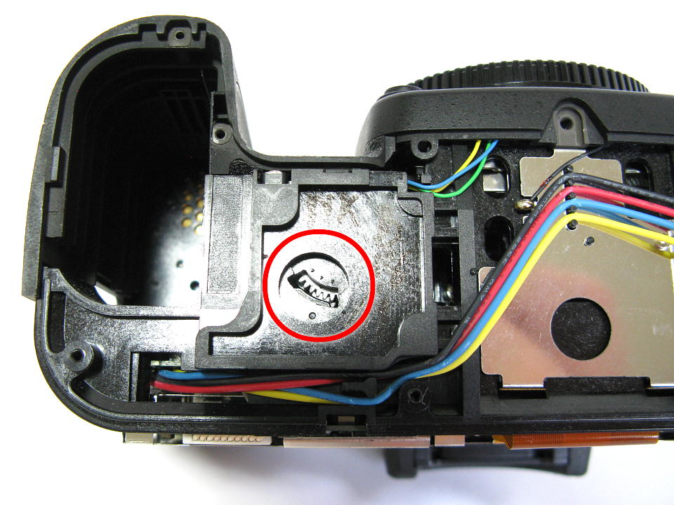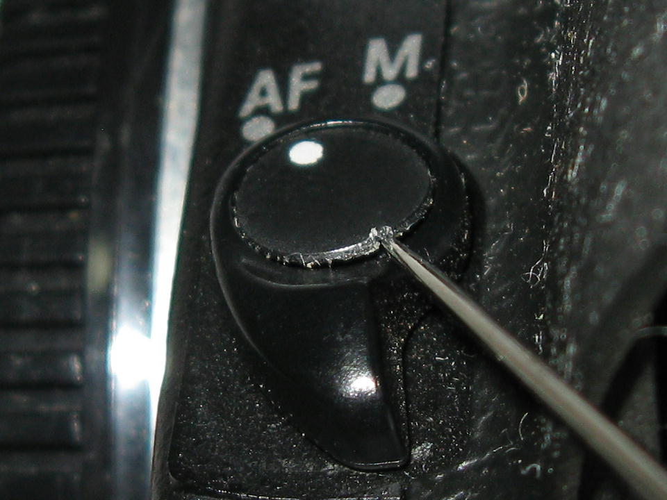 | そして、「フォーカスモードダイヤル」(AFとMFの切り替えスイッチ。) の目隠し蓋を針などで取ると…。 |
