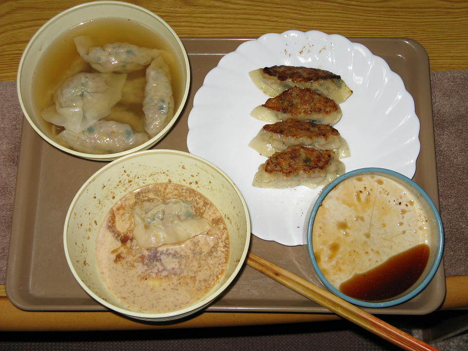 | 「ひと段落」したので、呑んじゃう。 今日のツマミは俺手造りの「白菜の水餃子&焼き餃子」。 水餃子はゴマだれでいただく。焼き餃子はポン酢醤油に辣油。 餃子は前日に拵えておいた。 前日、材料を買いに出かけたはいいものの、肝心の餃子の皮を買い忘れて帰ってきましたとさ…。 あ~情けなかった。すぐまた買いに出かけたよ。 か~ちゃん(妻=入院中)がいたら、大爆笑されたろうなぁ。 こんなこと、ど~でもい~ですね。 |