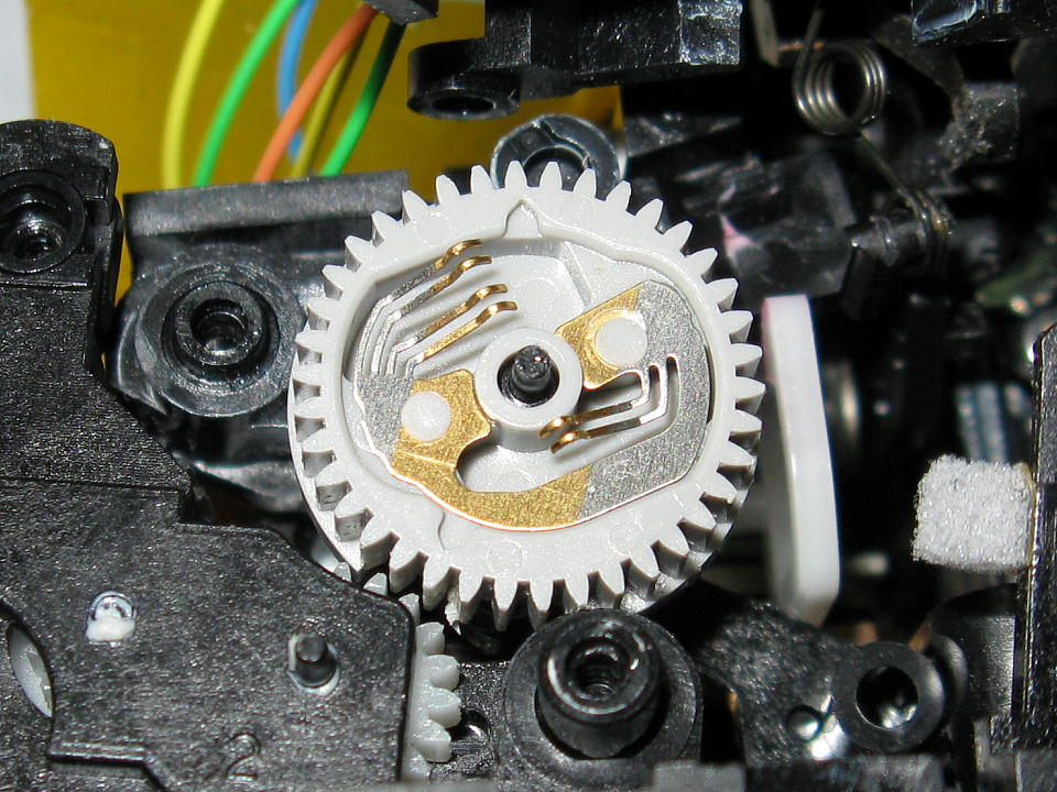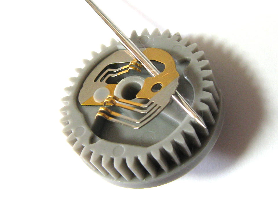 | 本来はプラスチックのギア部品の突起に金属をハメめて、 突起を熱でツブすことで金属を固定するのだと思われるが、 ツブしたプラスチックが剥がれてしまうと、金属の固定がなくなってしまい、 このように金属が浮いてしまう。 この金属端子が別の部品に接することで色々な役目を果たすのだが、 金属の固定がおぼつかない状態で「ヒゲ」のような端子に圧力がかかっても、 しっかり接しなくなってしまい、Errが出てしまうものと思われる。 ※針に糸くずが付いていたのは気が付かなかった(苦笑)。 |