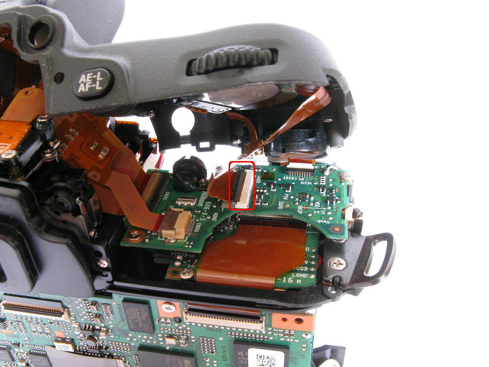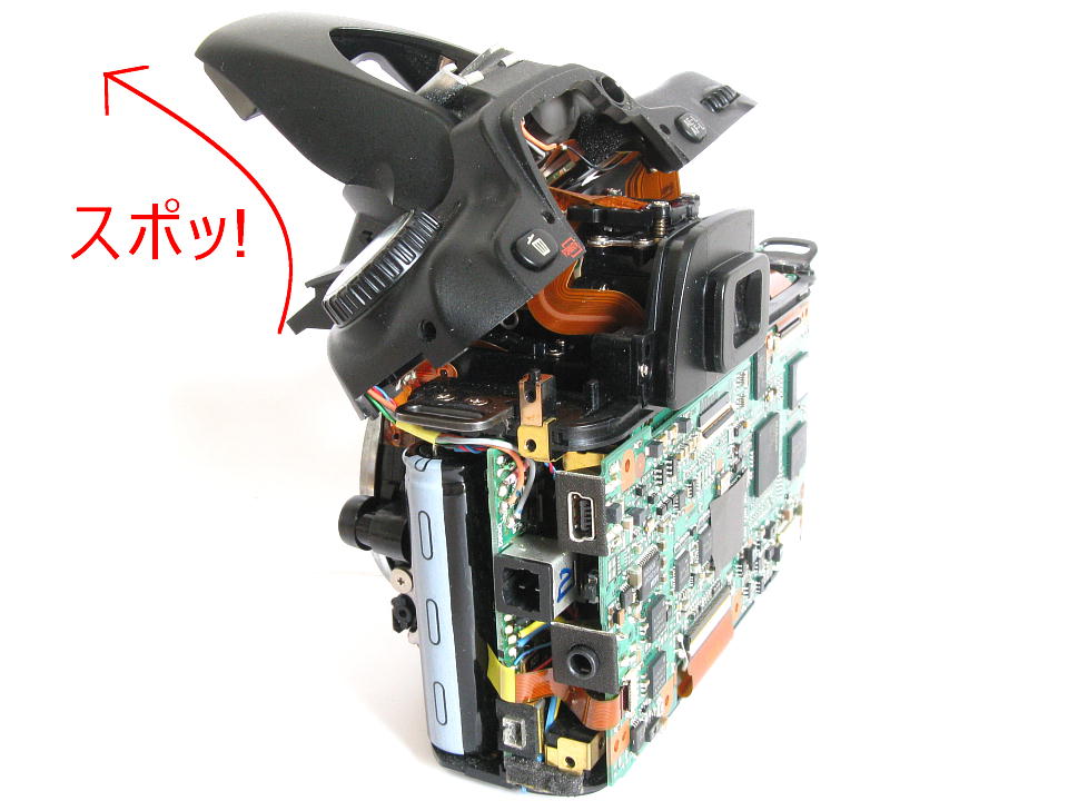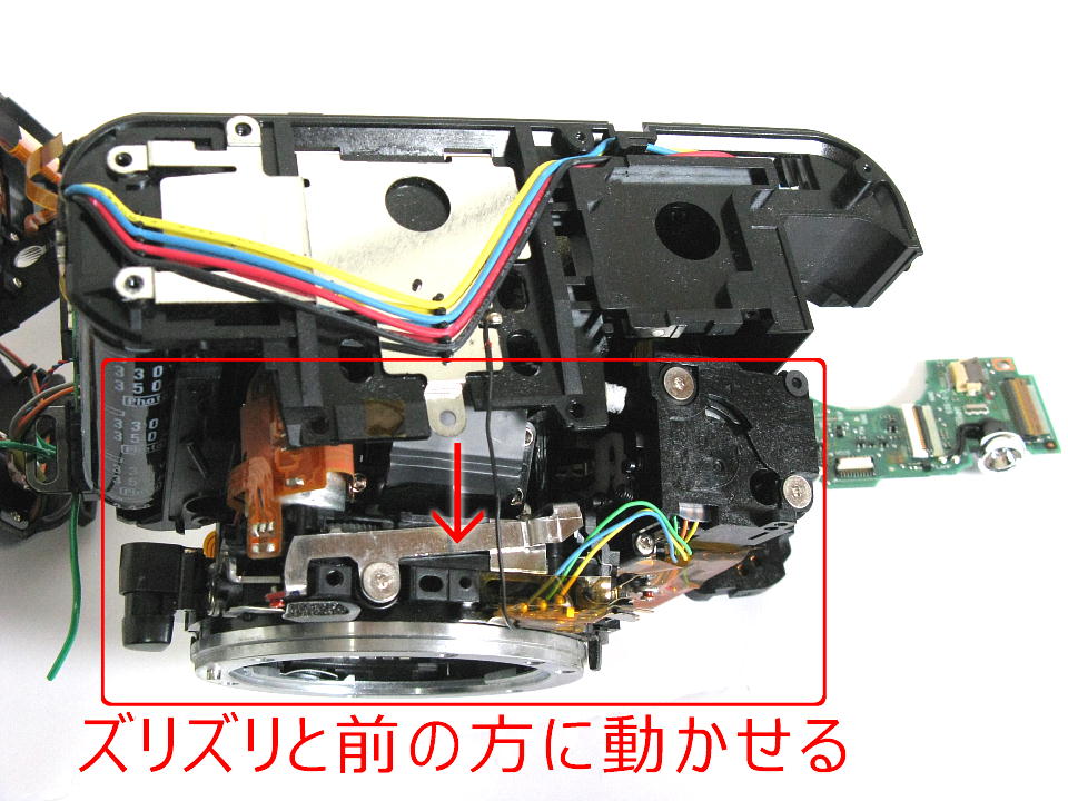 | ただし、外れるといっても底部のように本体から完全に分離してしまうのではなく、 シャッター部周辺にフレキがあるので、黒い部分を志ん朝じゃなかった慎重に持ち上げて、丁寧に外す。 |