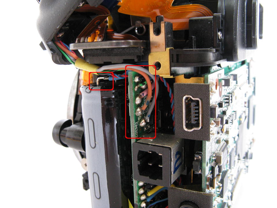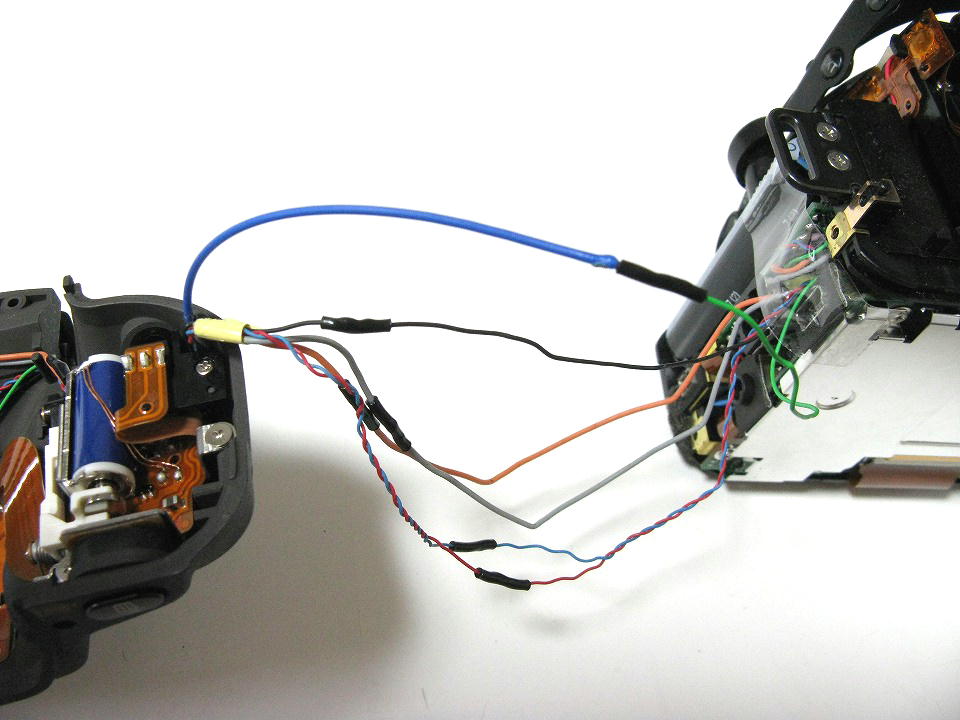 | シャッター部周辺のフレキが外れた状態。 「撮影モードダイヤル」周辺にはリード線が何本か来ている。 このリード線の本体側のハンダ付け部が非常に切れやすいので注意する。 1枚下の写真がその部分のアップ。 半田付けに自信があったりめんどくさがらないなら、 むしろ切断してしまった方が後の作業に気を遣わなくていいかも。 |