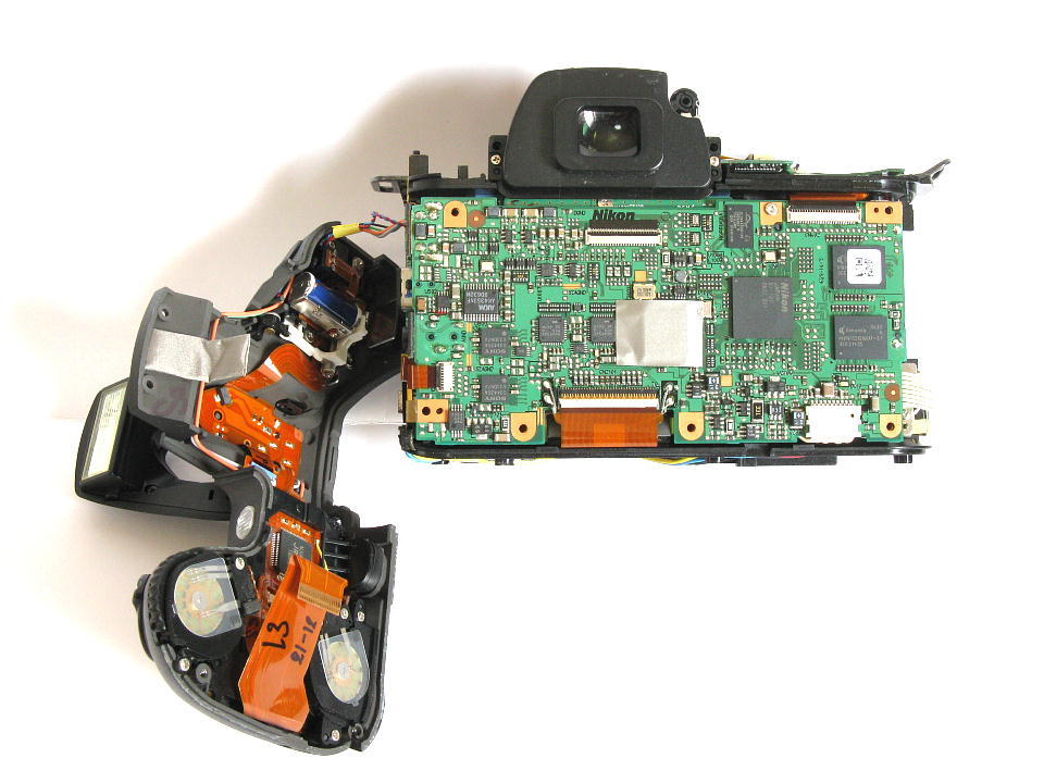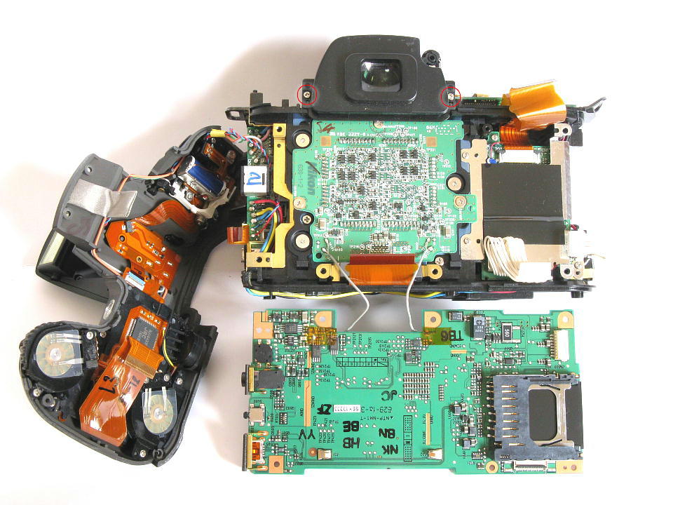 | 基盤が外れたが、グレーのリード線2本で もう1枚の基盤とつながっているので、扱いに注意する。 ビス2本で付いているファインダー周りの黒いプラスチック部品も外す。 |