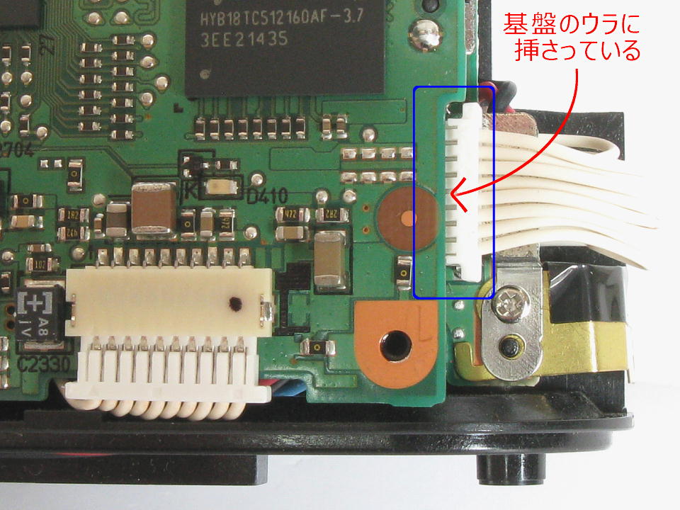 | 1枚上の写真の右下の辺り。 横のコネクターは基盤の裏に挿さっているからね。 写真は少し外しかけた状態。 |