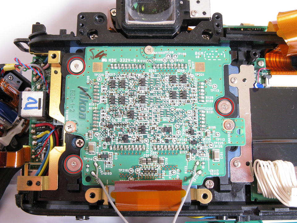 | 「撮影モードダイヤル」周辺に来ている何本かのリード線。 コンデンサーの端子や半田付けの部分に触りがちだよね。 うっかり触ると感電してびっくらこくよ。 |