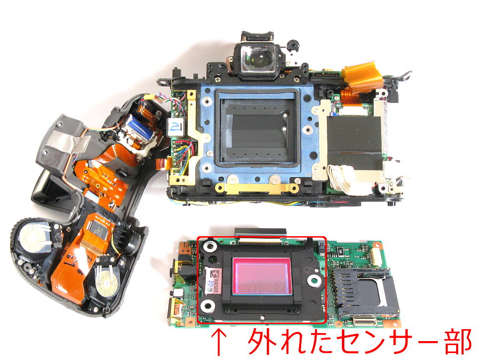 | 背面のもう1枚の基盤を外す。 この基盤の裏にCCDセンサーが付いている。 アタマの大きなビスが3本。 |
