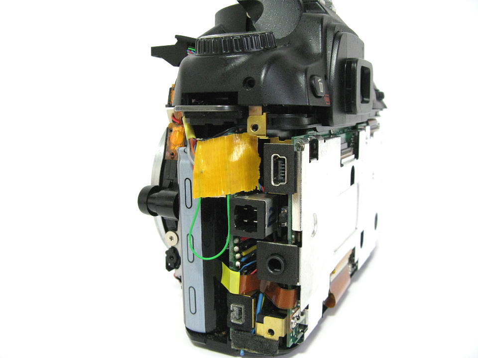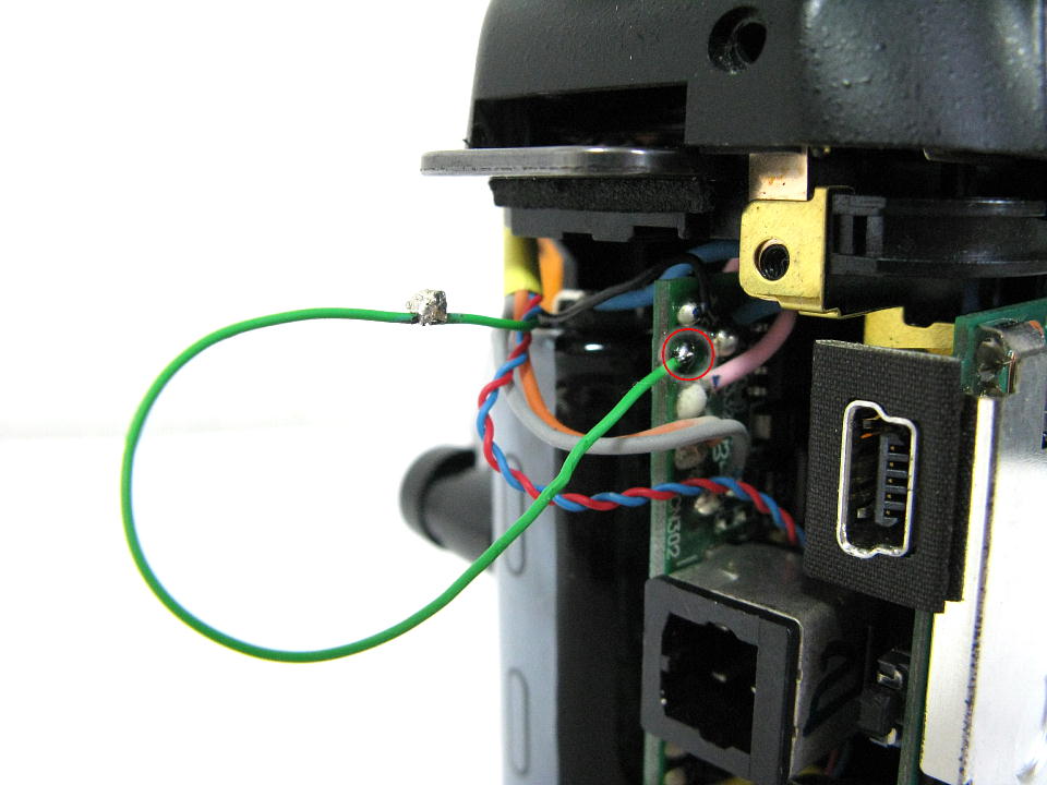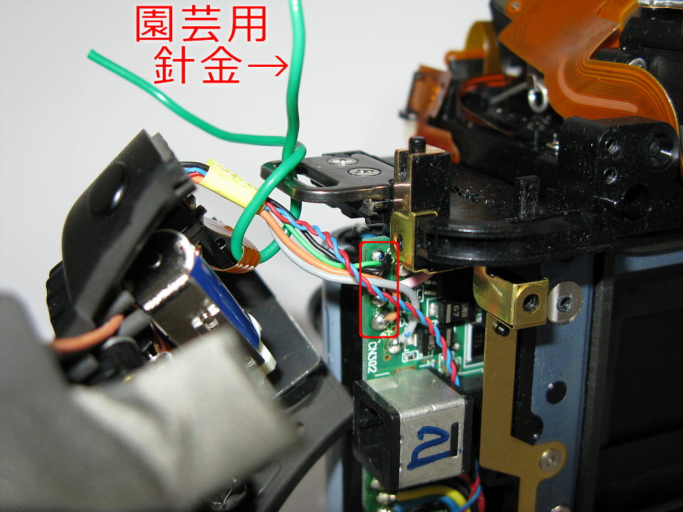 | と、この段階にきてやっと上部のリード線の保護として針金で養生した。 しかし、もっと早くやっておくべきだった。 上部を外してからこの段階まで、D80の本体をあっちに向けたりこっちに向けたり しているもんだから、緑のリード線などの半田付け部がかなり「緩く」なってきてしまっており、 その後、緑のリード線は結局切れてしまった…。 最初の練習と結局同じになってしまい、全く学習していない…。 |