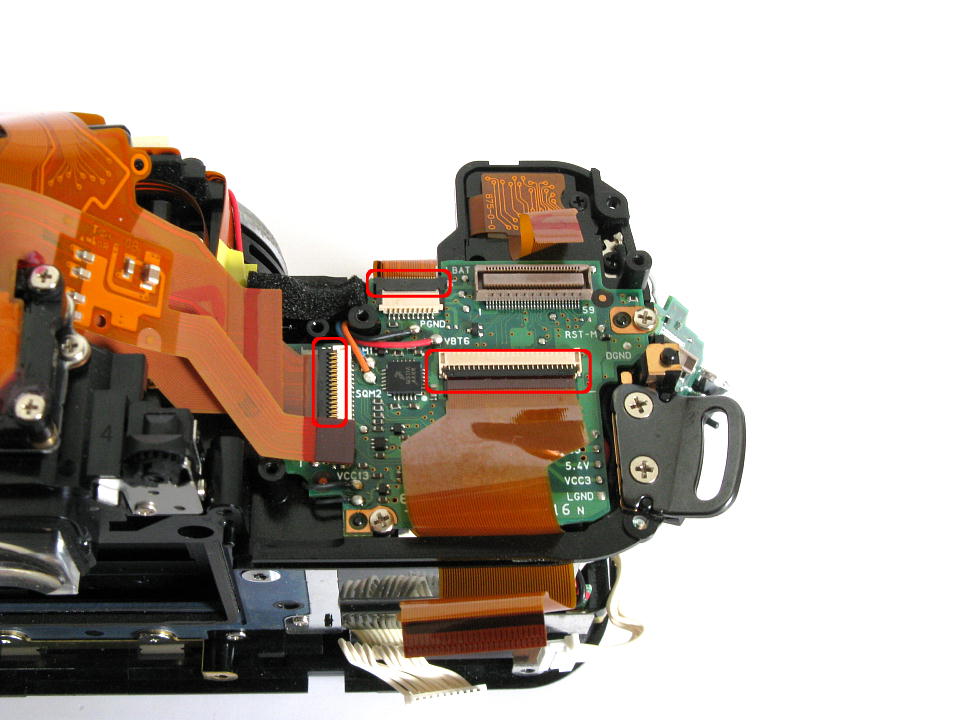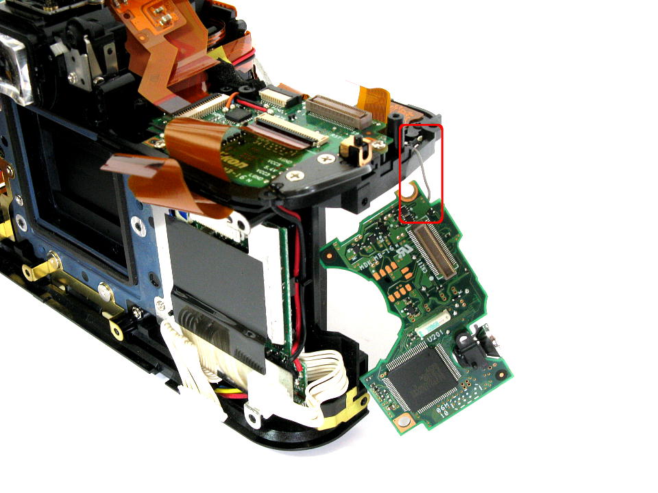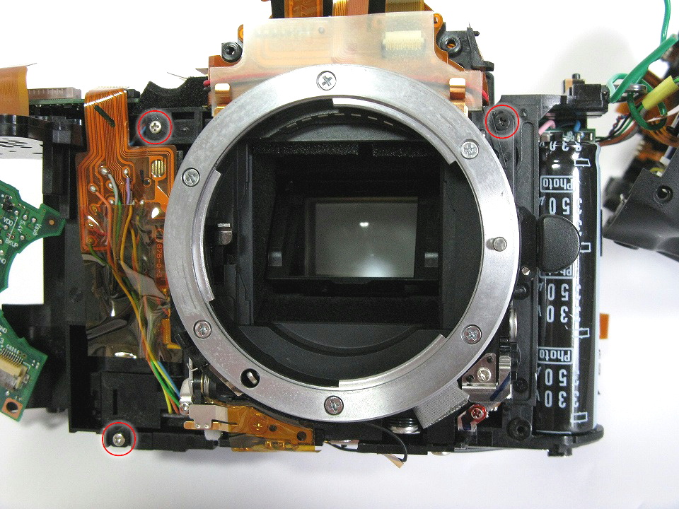 | シャッター部周辺の基盤を外す。 上下に2枚あるが、まずは上の物から。 写真左下のビスを外す前にフレキ(茶色の部分を持ち上げる。)を外した方が作業がしやすい。 |