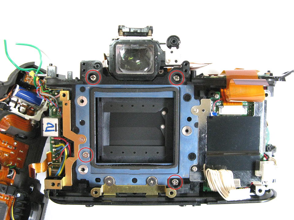 | さあ、いよいよシャッターユニットの取り外しにかかる。 背面のビスは4本。 |