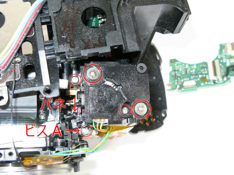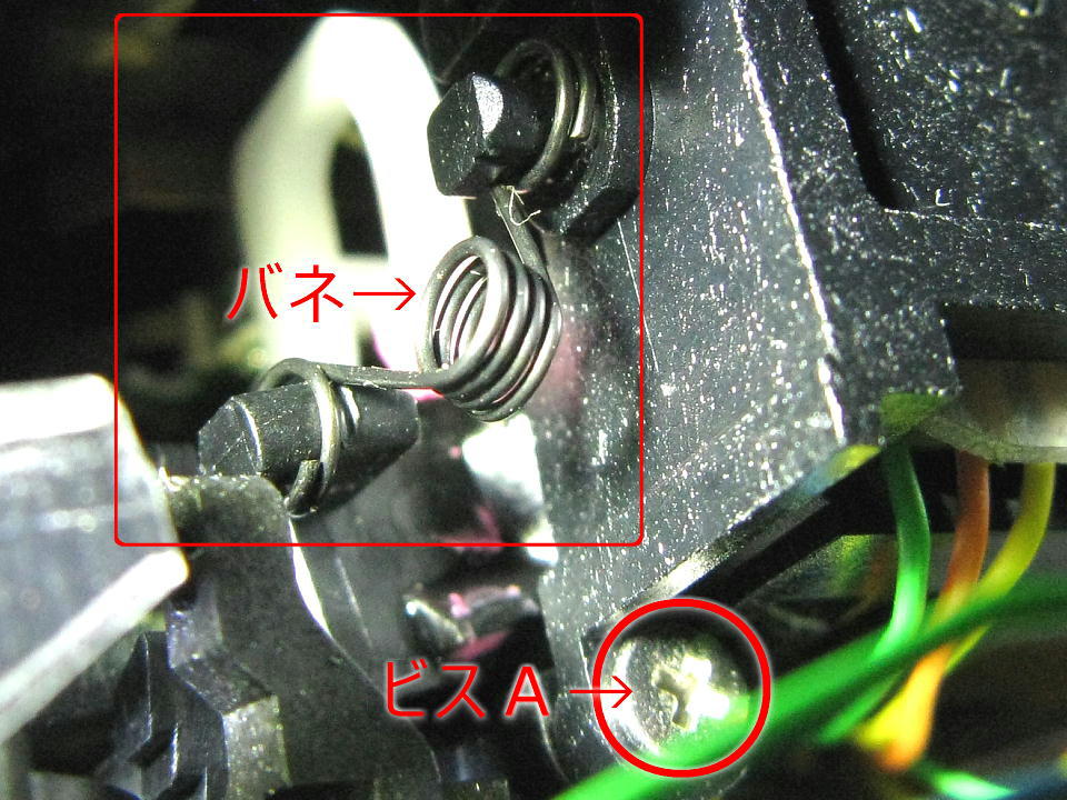 | ビス(特にA)を外す前に、バネの取り付け方を確認しておこう。 取り付け方を憶えておけば、もしバネを飛ばしてしまっても、 慌てることなく組み付けられるよ。 |