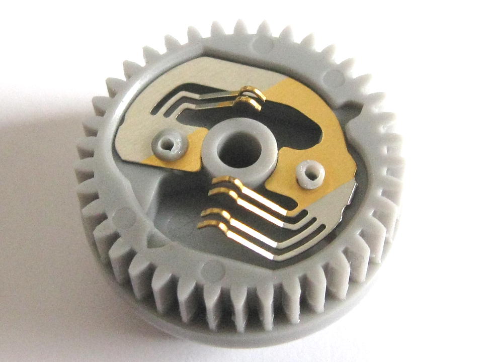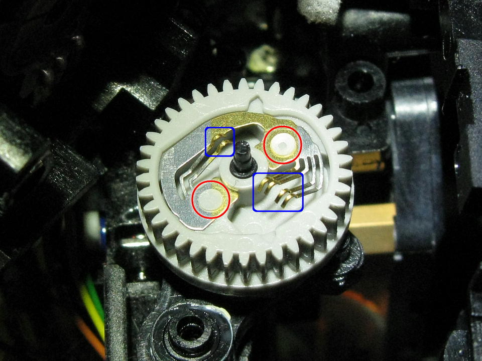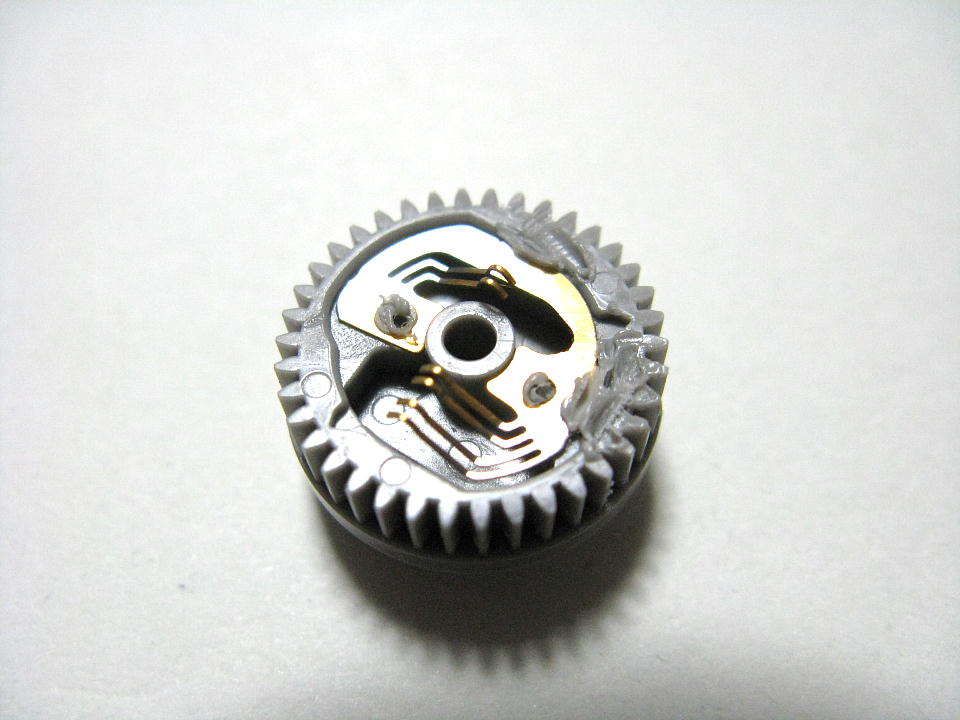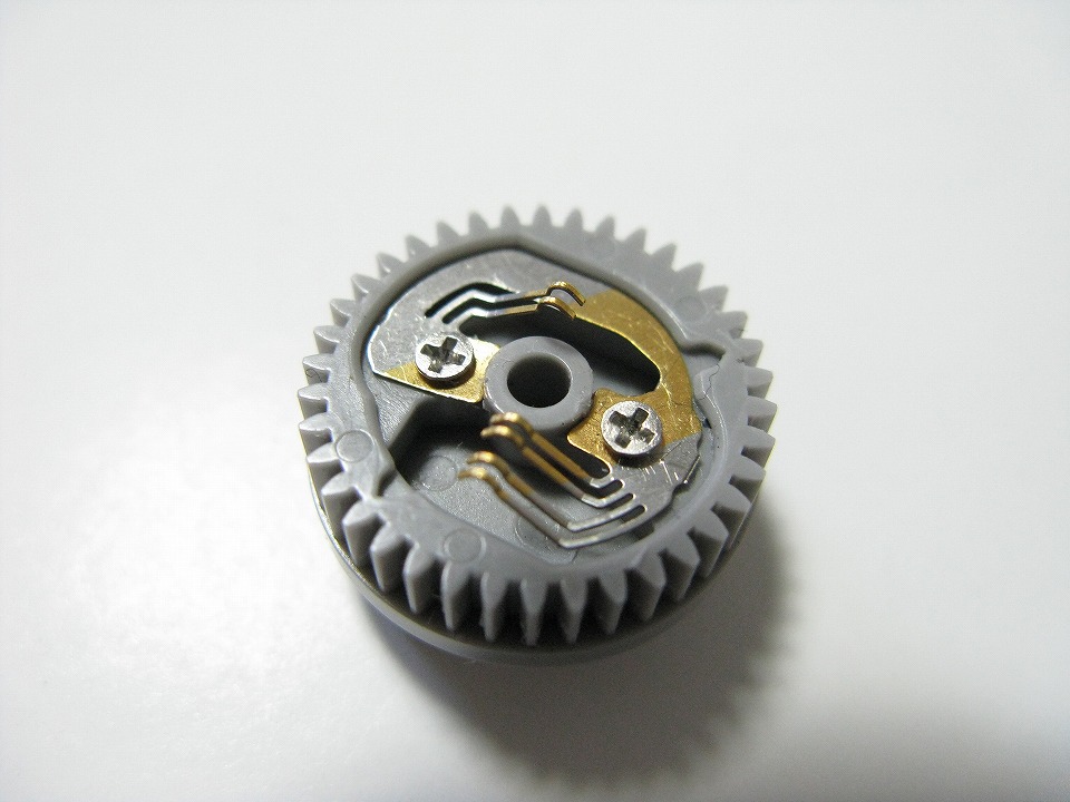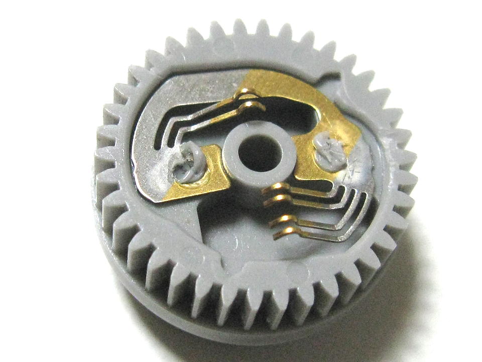 | 黒いケースのようになっているギア部周辺のビス5本(2枚上写真の○)を外して、 ようやく辿り着いたギア部品。 □の金属端子をしっかり浮き上がらせるために ○の部分で金属部品を押さえている。 部品の構成としては、プラスチックの突起に金属部品をハメ、突起の上から熱でツブしている。 この熱でツブした○部の不具合(取れてしまう)でErr表示になるらしい。 しかし、この個体の部品は、ぱっと見は何も問題なさそうだ。 もしかしてErrの原因はここじゃないのか…。 |