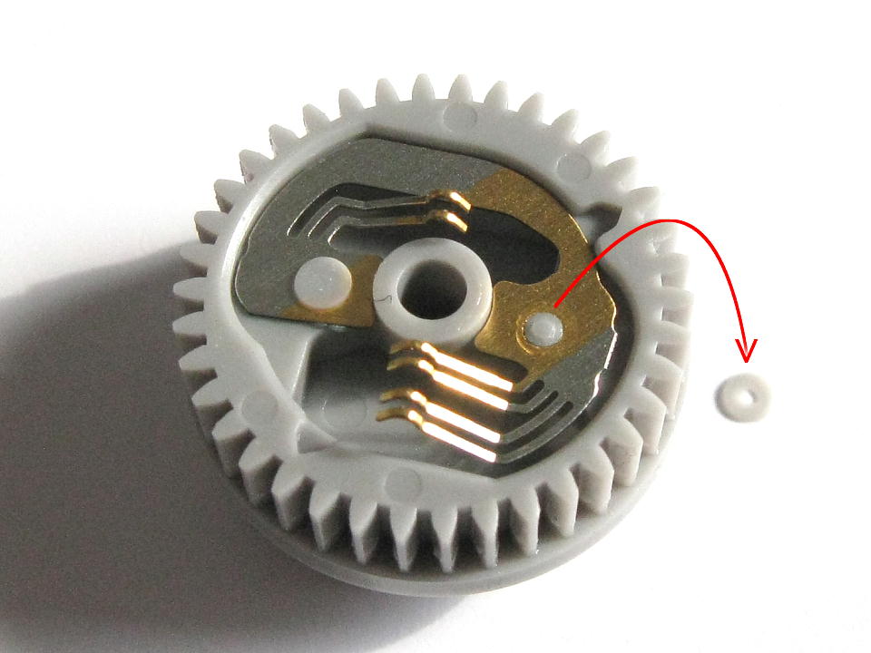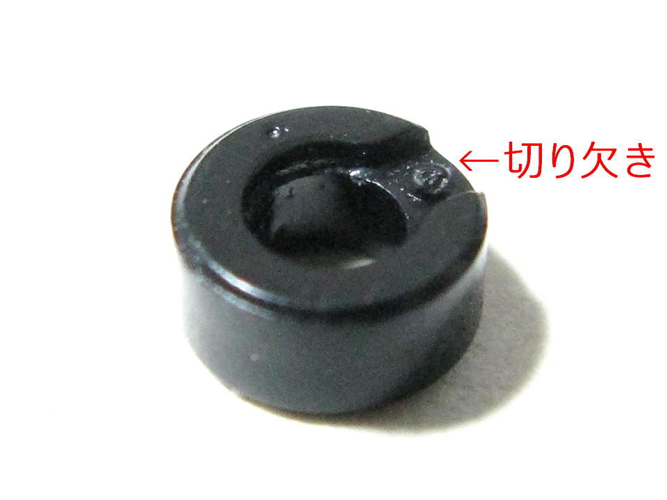 | ちなみに、これがそのプラスチックのワッシャー。 この部品には片方の面だけに写真のような切り欠きがある。 もしこの部品が取れてしまったときは、この切り欠きをギア部品側にして取り付ける。 1枚上の写真でも切り欠きが確認できる。 |