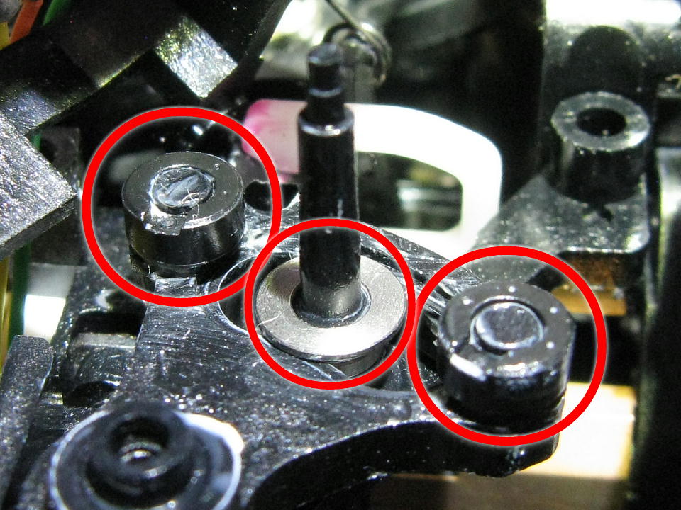 | この写真は、プラスチックのギア部品が付いていた周辺。 中心の棒にギア部品が挿さっていた。そしてここに金属のワッシャー(○)が付いている。 場合によっては、ギア部品を取り外すときに、グリスの粘着力によって、 このワッシャーがギア部品にくっついてくることがあるので注意する。 また、両側の2か所の○の部分にはプラスチックのワッシャー?がはまっていて、 これもギア部品にくっついてきたり取れやすいので、なくさないように気を付けよう。 もし取れてシャッターボックスの中に落ちてしまったら、取り出すのはかなり困難だ。 他の部品取りでもあればなんとかなるかもしれないが、そうじゃないときは修理を諦めるしかなくなるよ~(実は経験者。)。 |