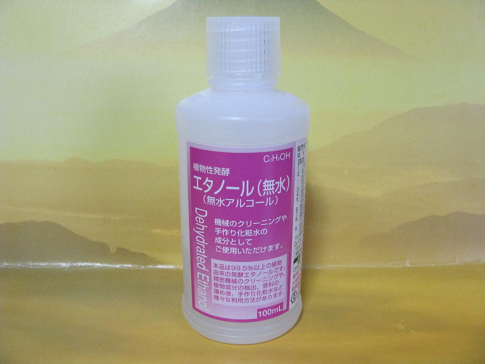 | 【おまけ:グリップ部などのベタつきの除去について】 Nikonに多いのかどうかは分からないが、このベタつきってホントに気持ち悪いよね。 そもそも、こうなる素材をなぜ採用するのかが分からない。 保管に気を付けるか、ベタつく前に買い替えろってことなのかな。 このベタつきの除去に絶大な威力を発揮してくれるのが無水エタノールだ。 写真は100mlのもの。 カメラのグリップ部のベタつき除去なら100mlもあれば十分すぎるのだが、 いかんせん田舎の信州では、そんな小容量のものを置いている店がなく、みんな500mlだった。 ネットでは簡単にGETできるが、送料を考えるとアホらしい。 そんな状況の中、普段は行かないエリアのドラッグストアーまで巡って、やっと見つけた。 ガス代はきっと送料よりかかっていると思うけど、 この1本のためにうろちょろしたわけではないので、いいのだよ。 |