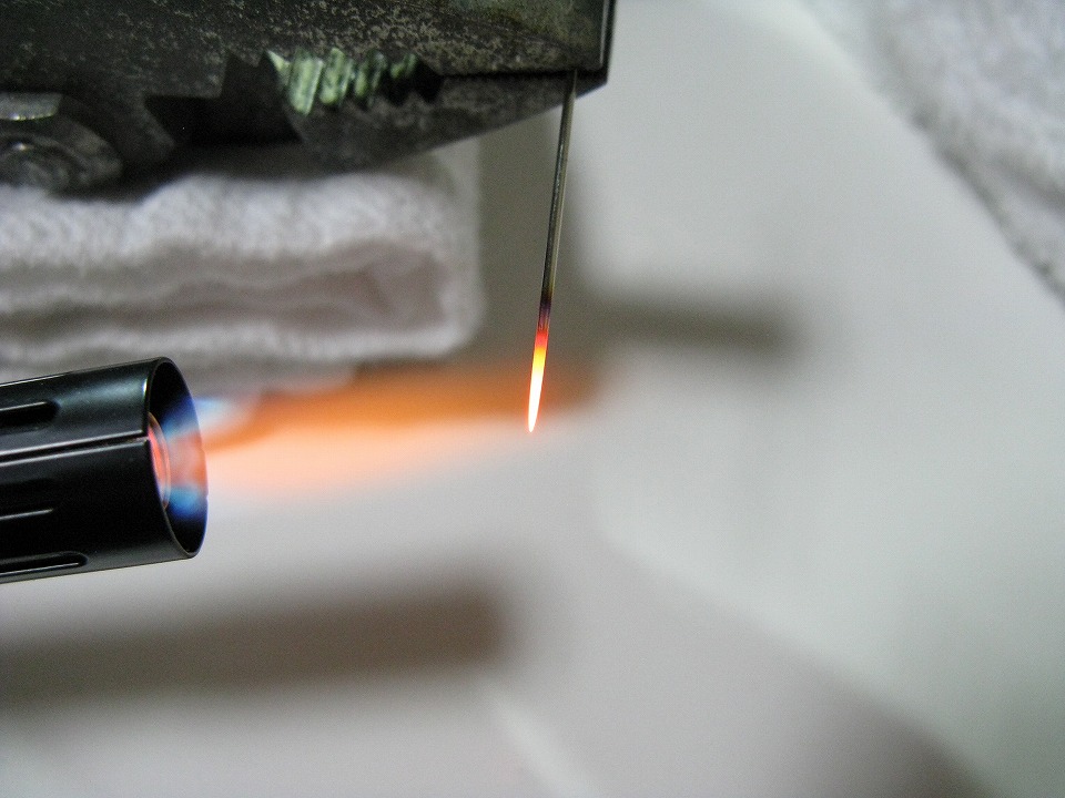 | 金属の固定方法はいくつか考えられるが、 なるべく手間がかからず、そして効果を発揮する方法をいろいろ考えた結果、 「熱針地獄」に処することにした(笑)。 方法は簡単だが、針を刺す「焦点」を定めるのにコツが要る。 裁縫針をプライヤーやペンチで持って、針の先端を熱する。 するとすぐにオレンジ色に焼ける。 |