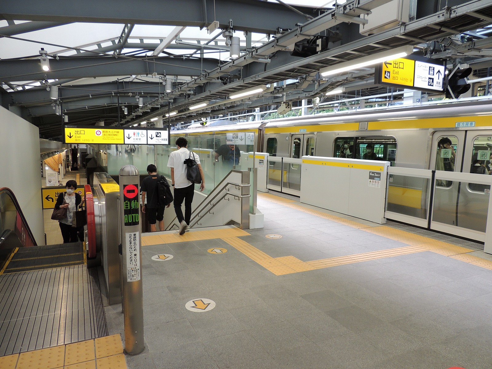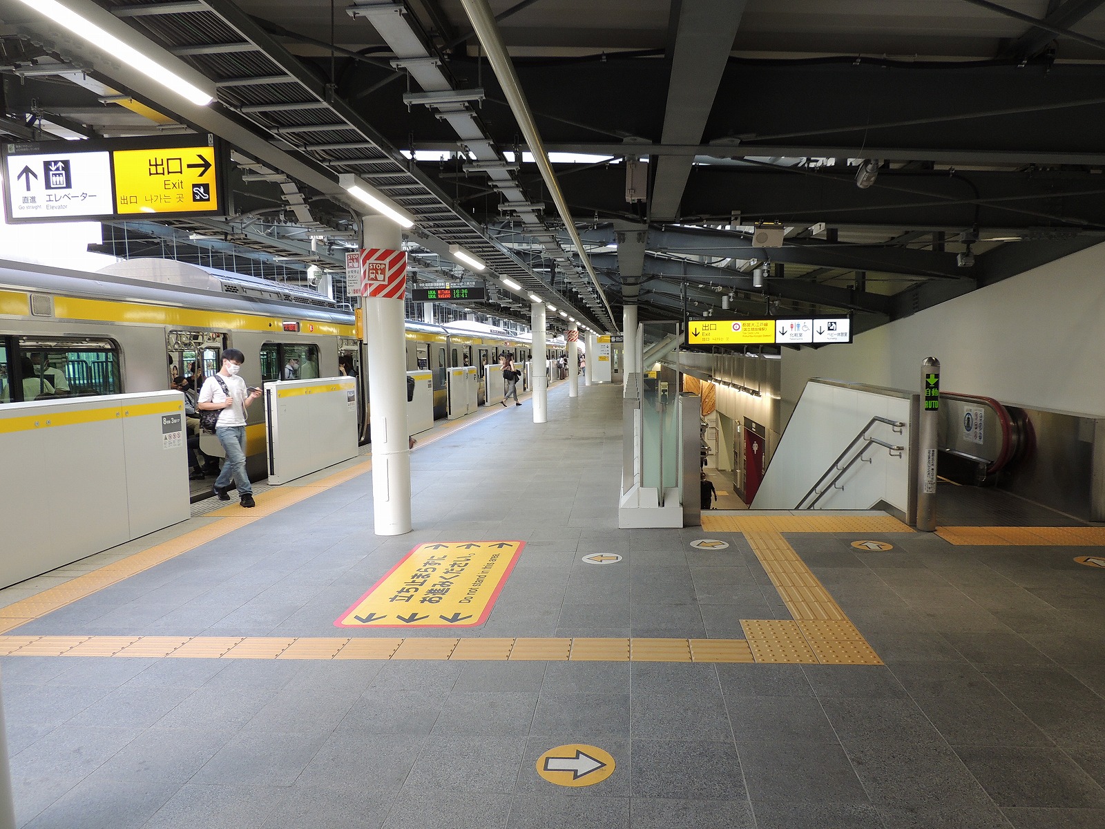 | JR中央本線の千駄ケ谷駅。 アキバ方面からの電車が到着したところ。 下りエスカレーターは8号車付近だよ。階段も併設されている。 この駅を普段利用している方からすれば「総武線じゃん!」ってツッコミが来そうだが、 停まる電車の色はともかく、路線としては中央本線なのだよ。 |