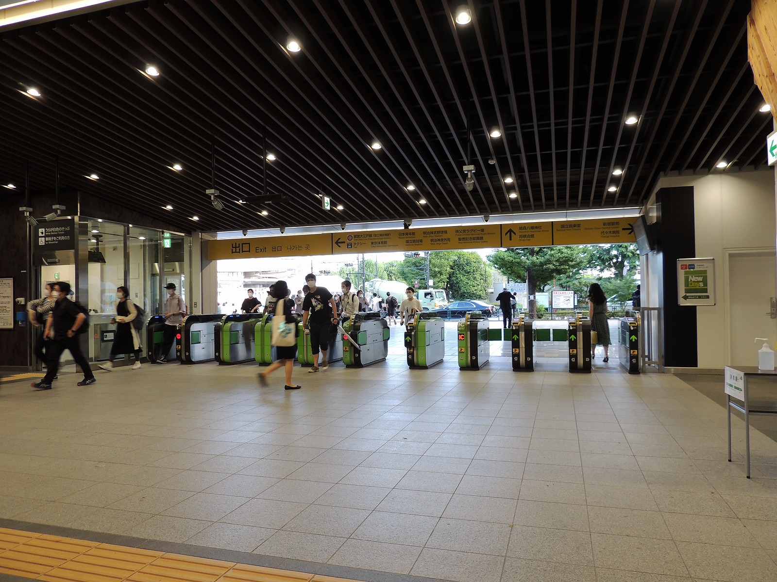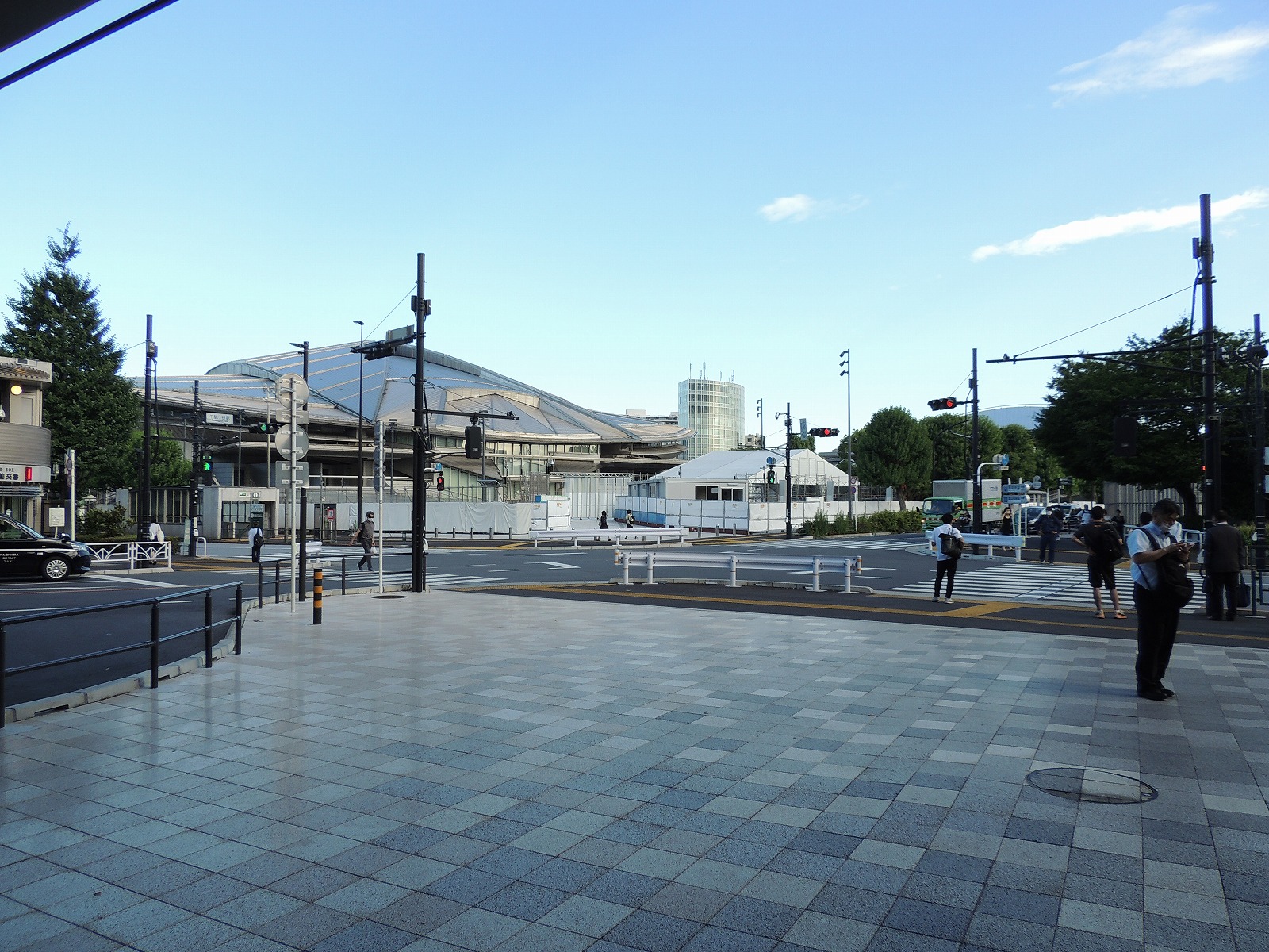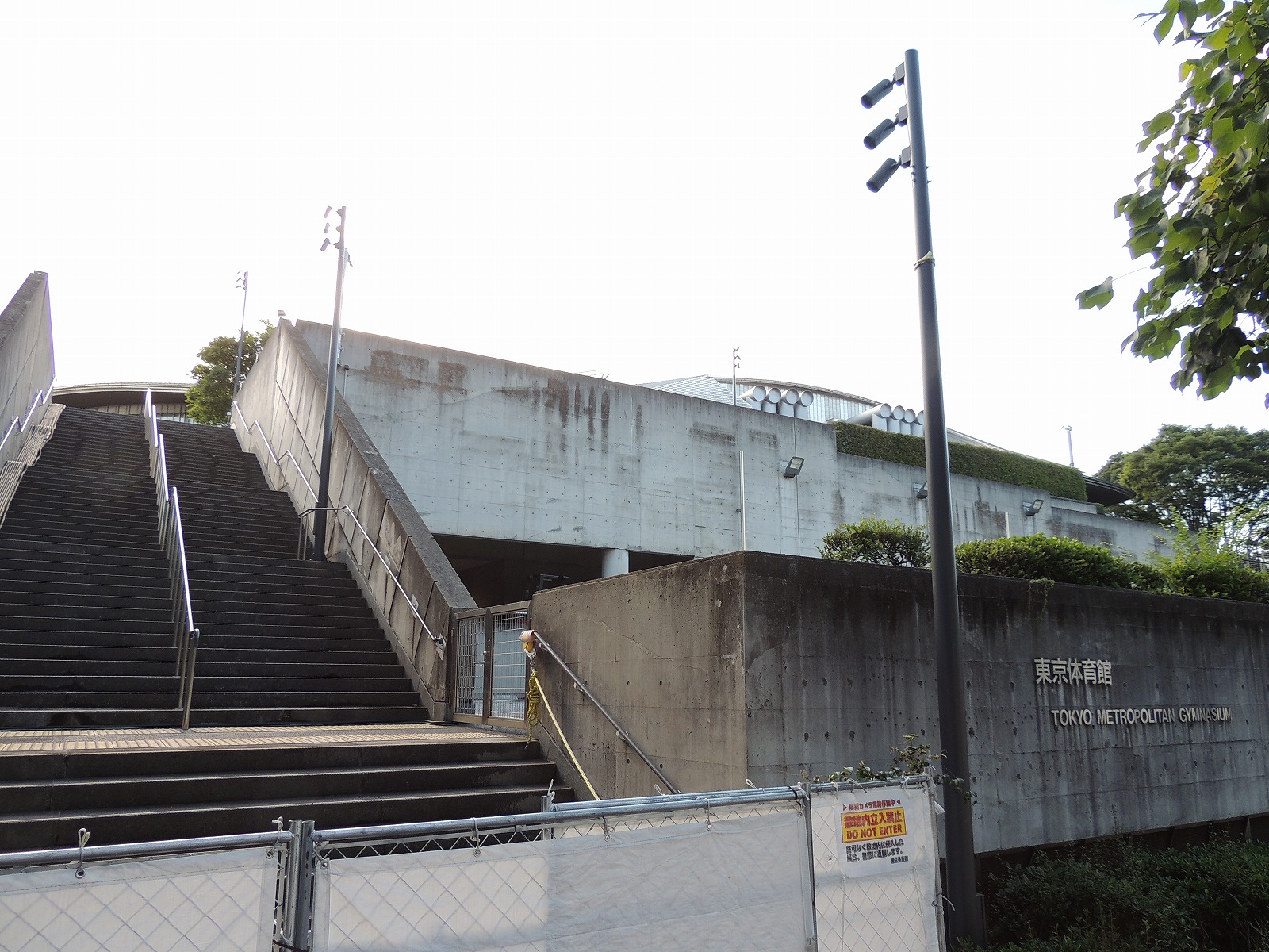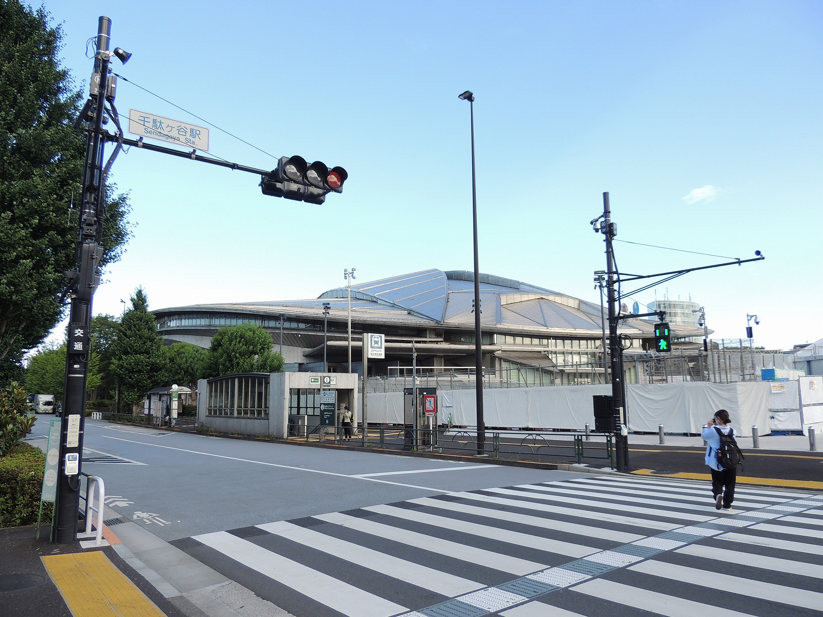 | 改札口を背にして撮影。 すぐ左に東京体育館がこんにちは。 あれれ、敷地の周りには白いボードが張り巡らされているゾ。 敷地内には入れなさそうだな、こりゃ。 |