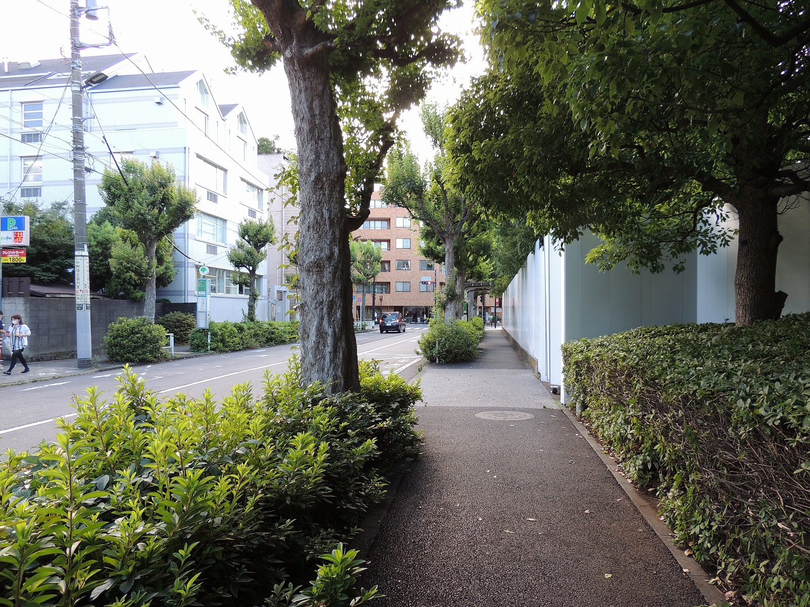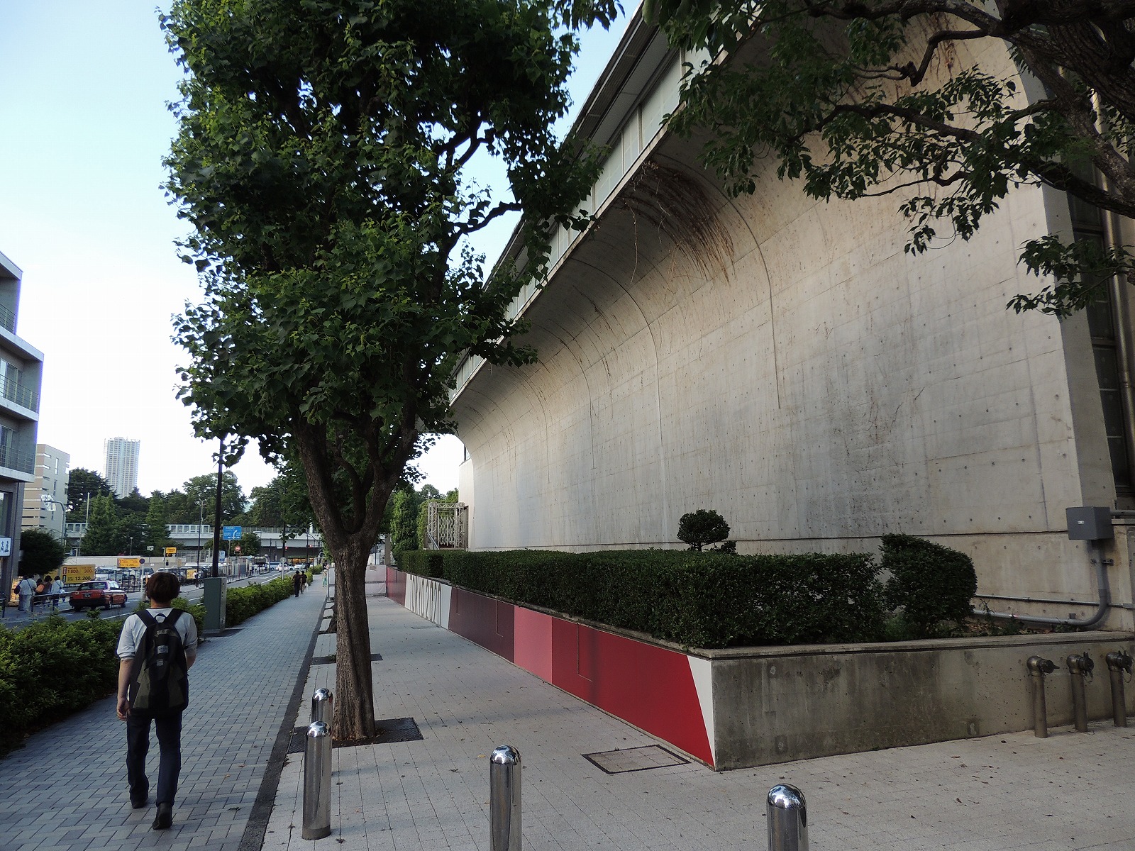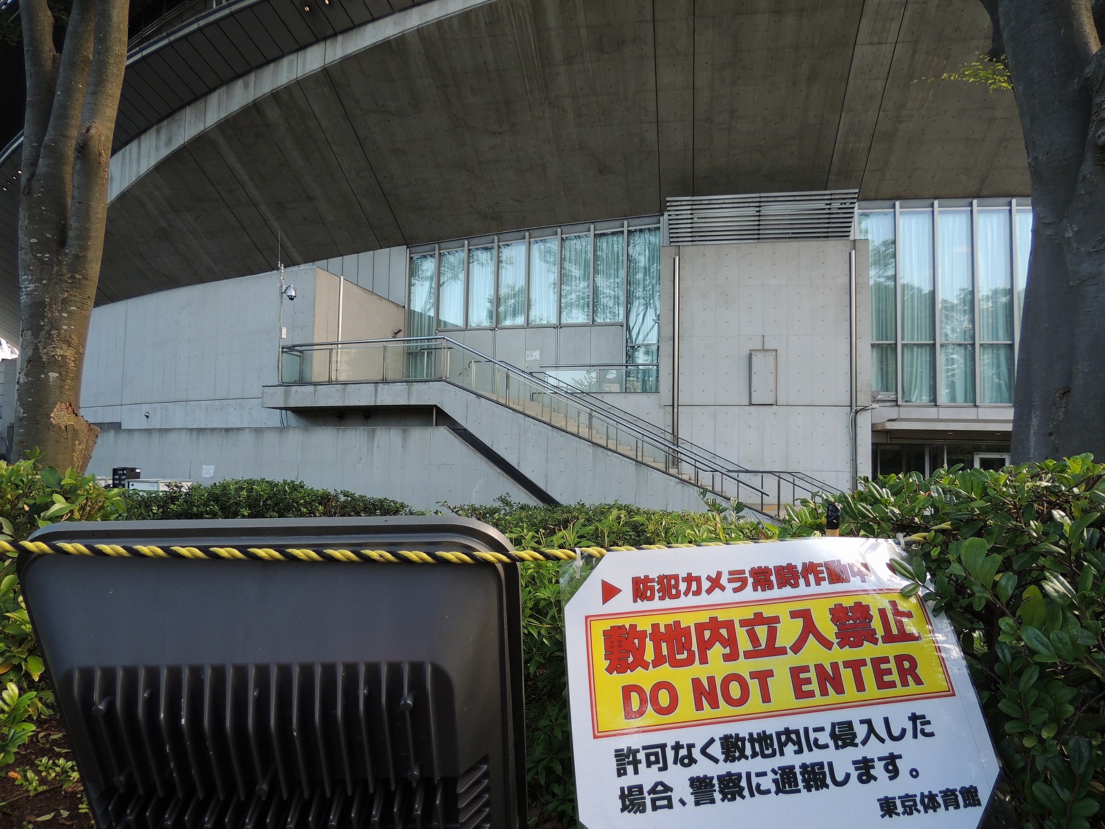 | 南辺を西進する。 東京体育館の敷地境にはことごとく白板が立っている。 もうちょっと敷地内を歩けるようにでもしてくれていれば、 誰でもオリンピック会場の近くを通ることができ、 親密度も増すんだろうと思うのだが、その辺りが「日本的」なのかね。 |