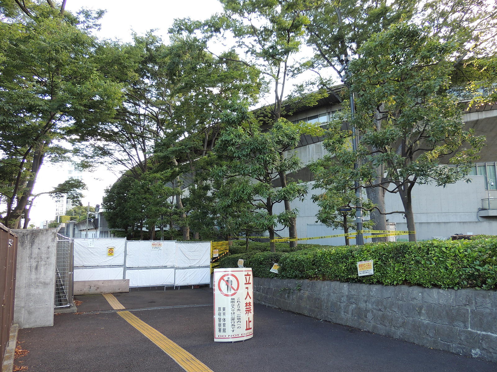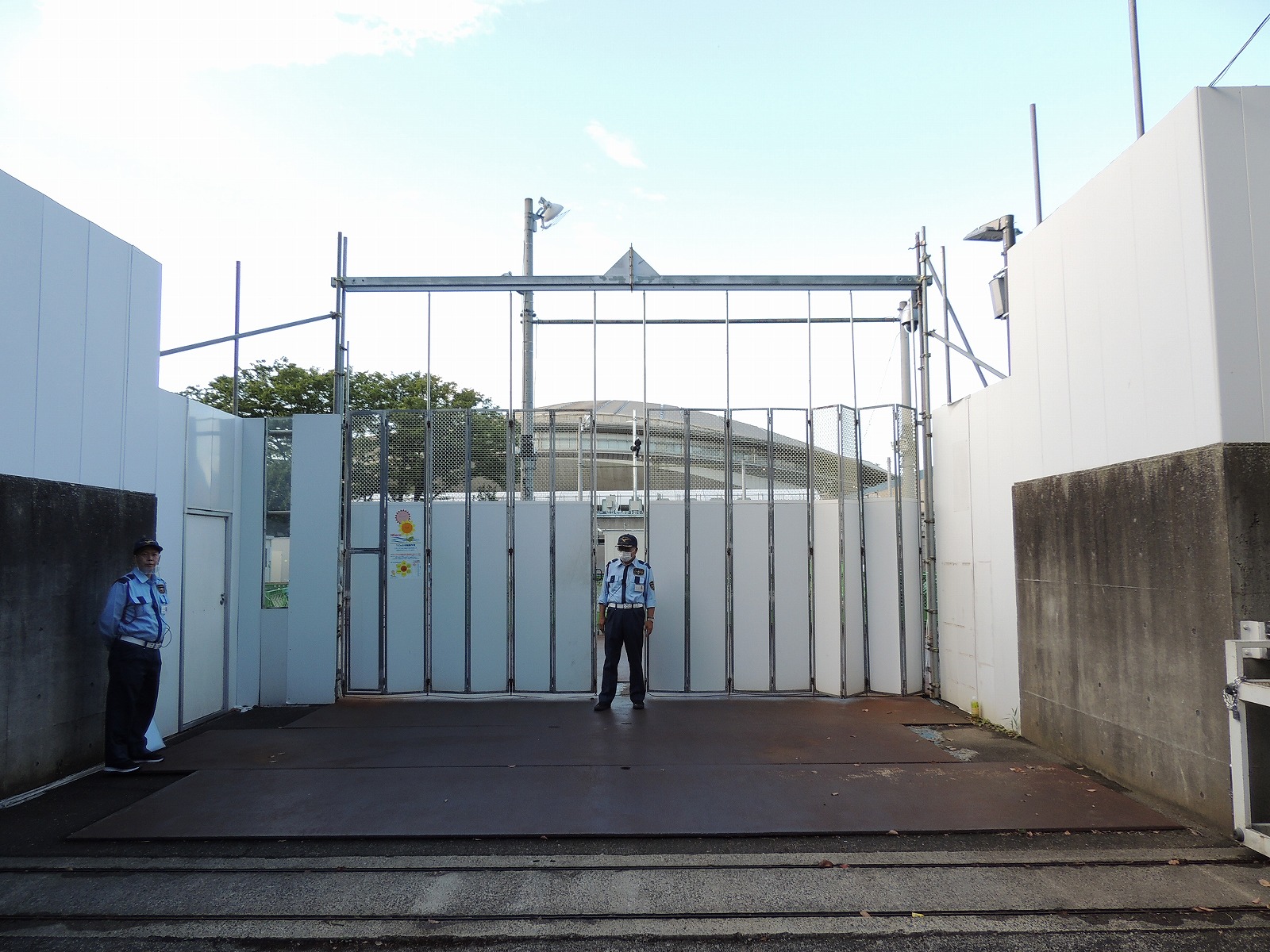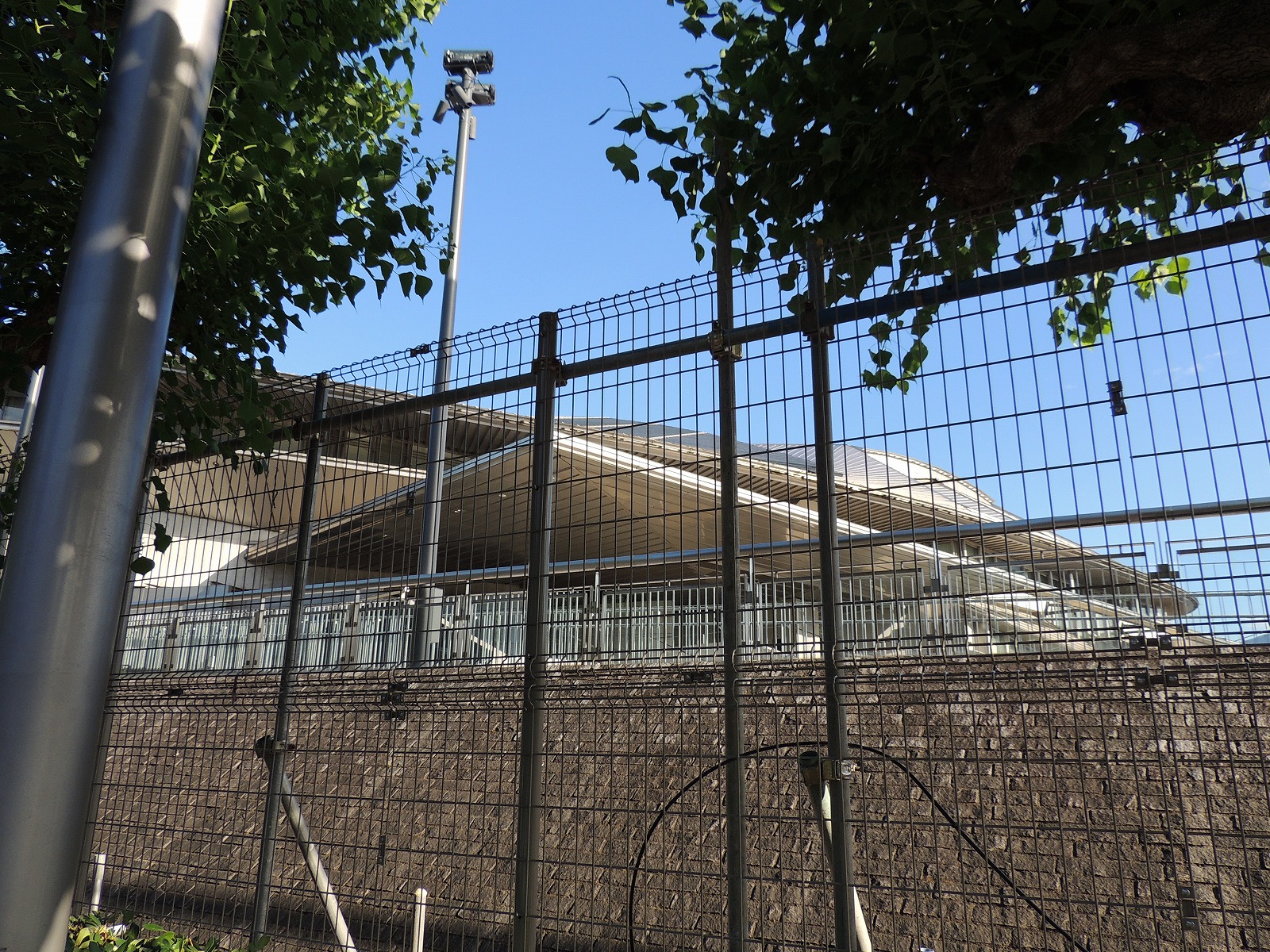 | 東辺の上の写真の場所から北(JR線)方向を撮影。 上の覆いは、東京体育館と新国立競技場を結ぶ通路。 新国立競技場も今(2021/06)現在、敷地に入れない。 |