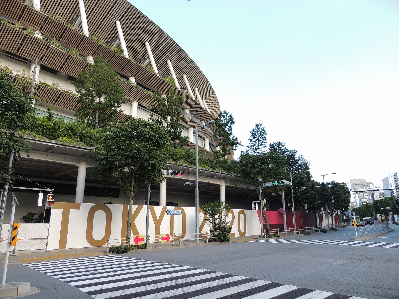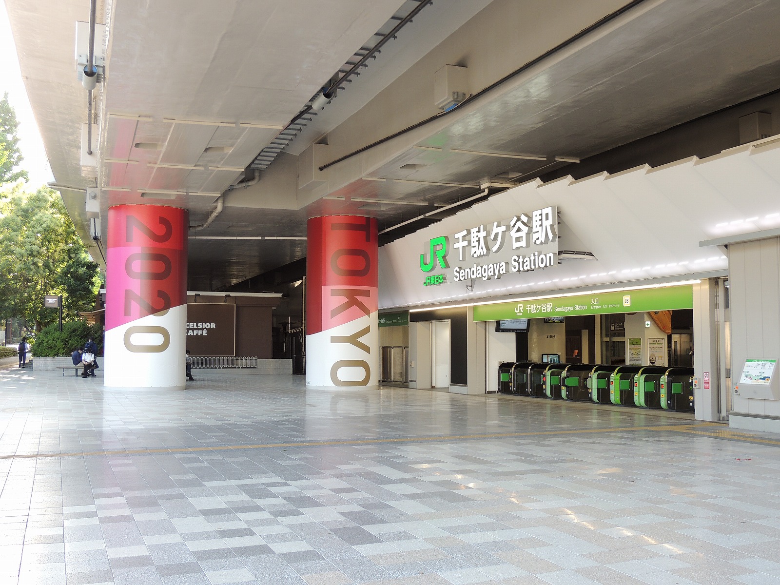 | 駅の外に出ると、柱に「TOKYO2020」のデザイン! この写真は、奇跡的に人が切れた瞬間に撮影。 |