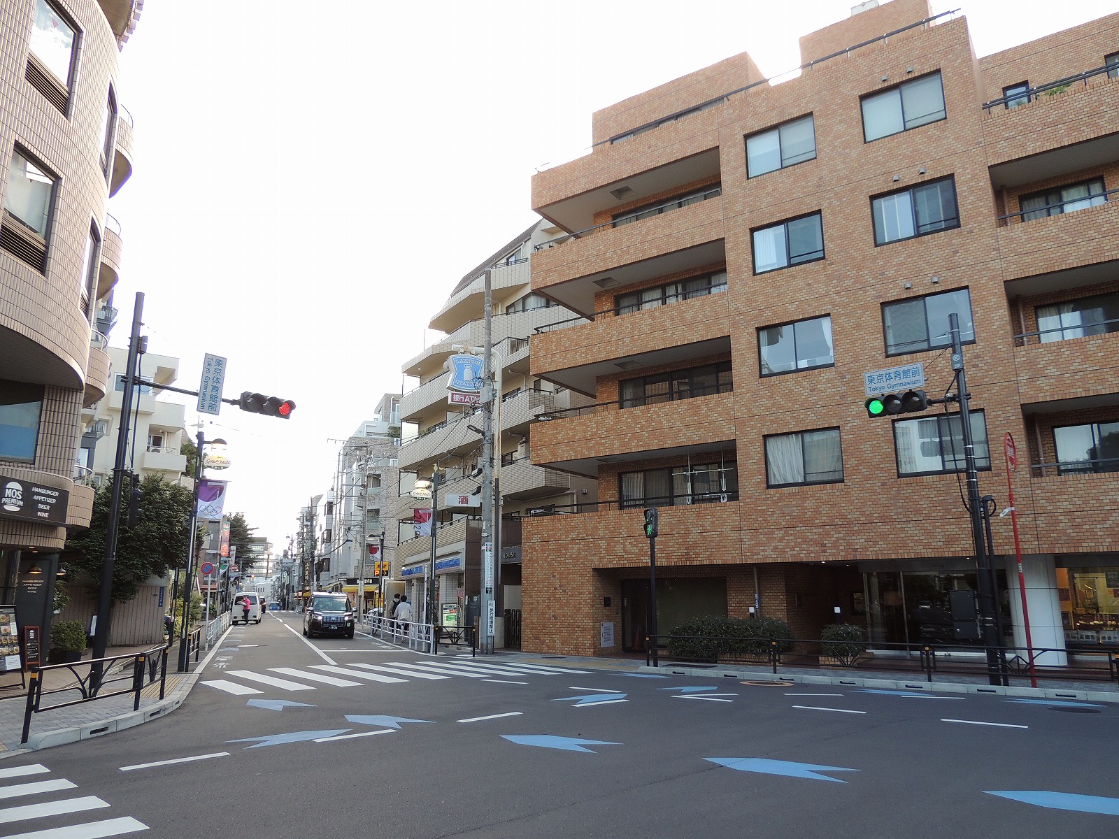 | 南東角の「東京体育館」交差点。 左に写っている建物は、新国立競技場。 |