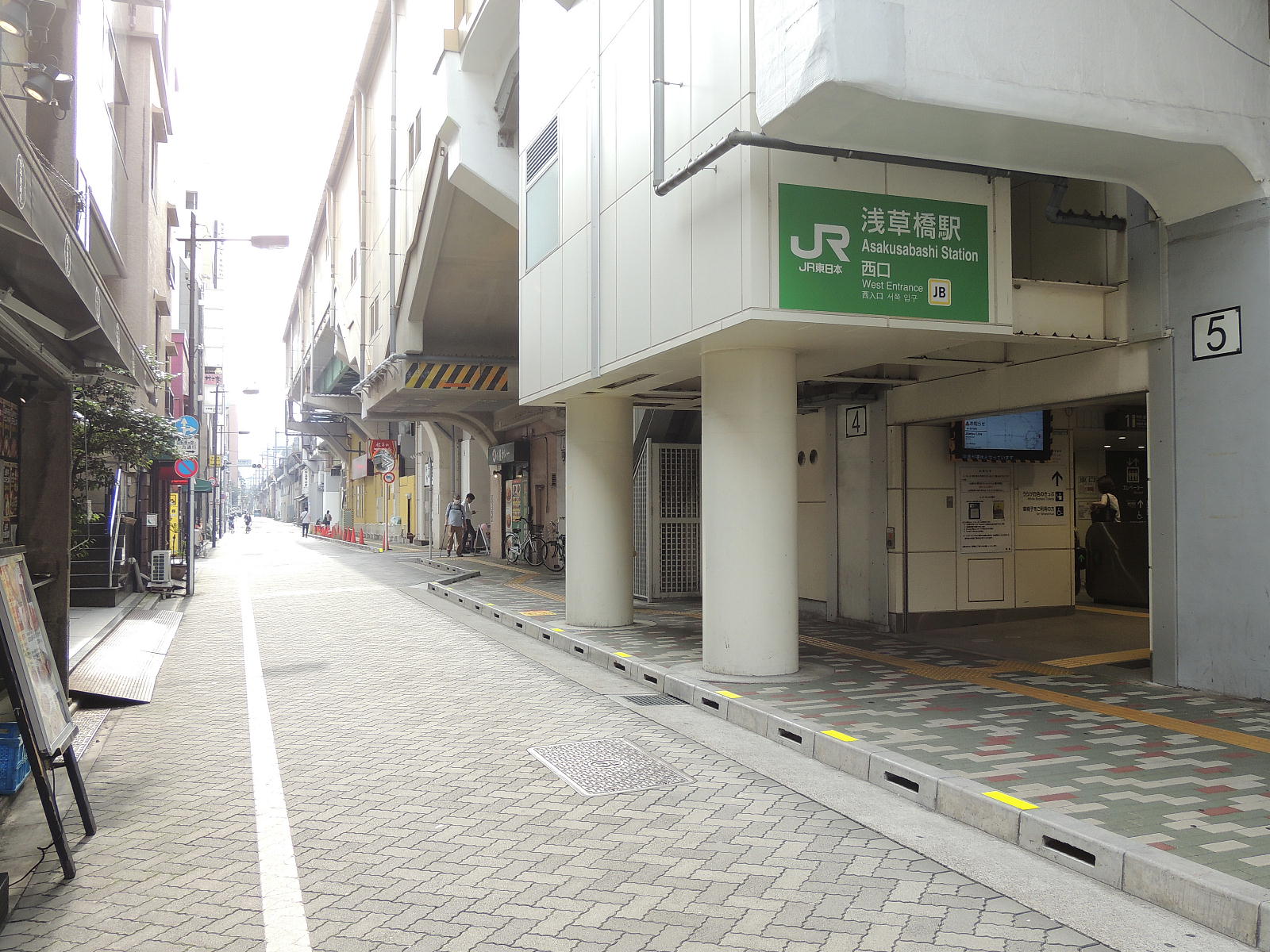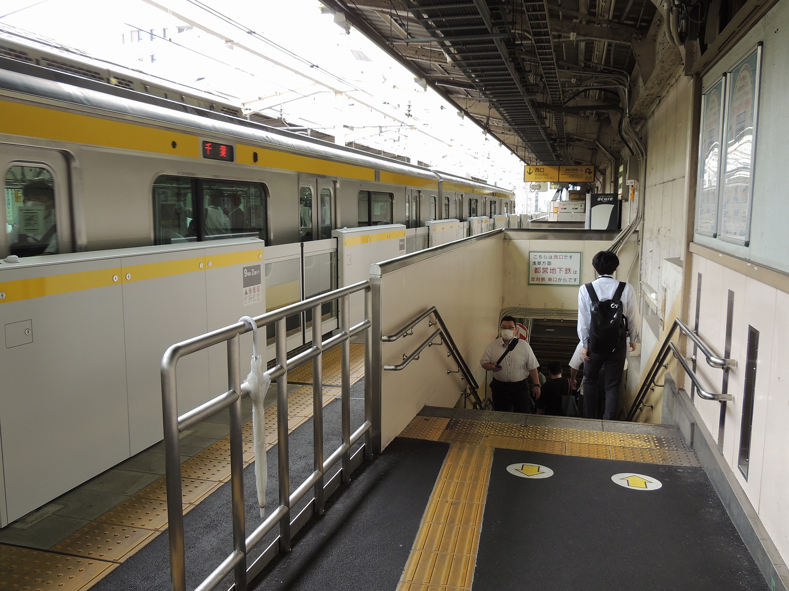 | さて、今度はJR総武線の浅草橋駅から宿へ行ってみる。 宿に近い西口に出る階段は、9号車付近にある。 ちなみに千駄ケ谷駅は、階段や下りのエスカレーターが8号車付近だから、 浅草橋駅とほぼほぼ近い位置。 どちらの駅でも車内やホームを歩く必要がほとんどないのはありがたい。 誰か、傘を忘れてるね(笑)。 |