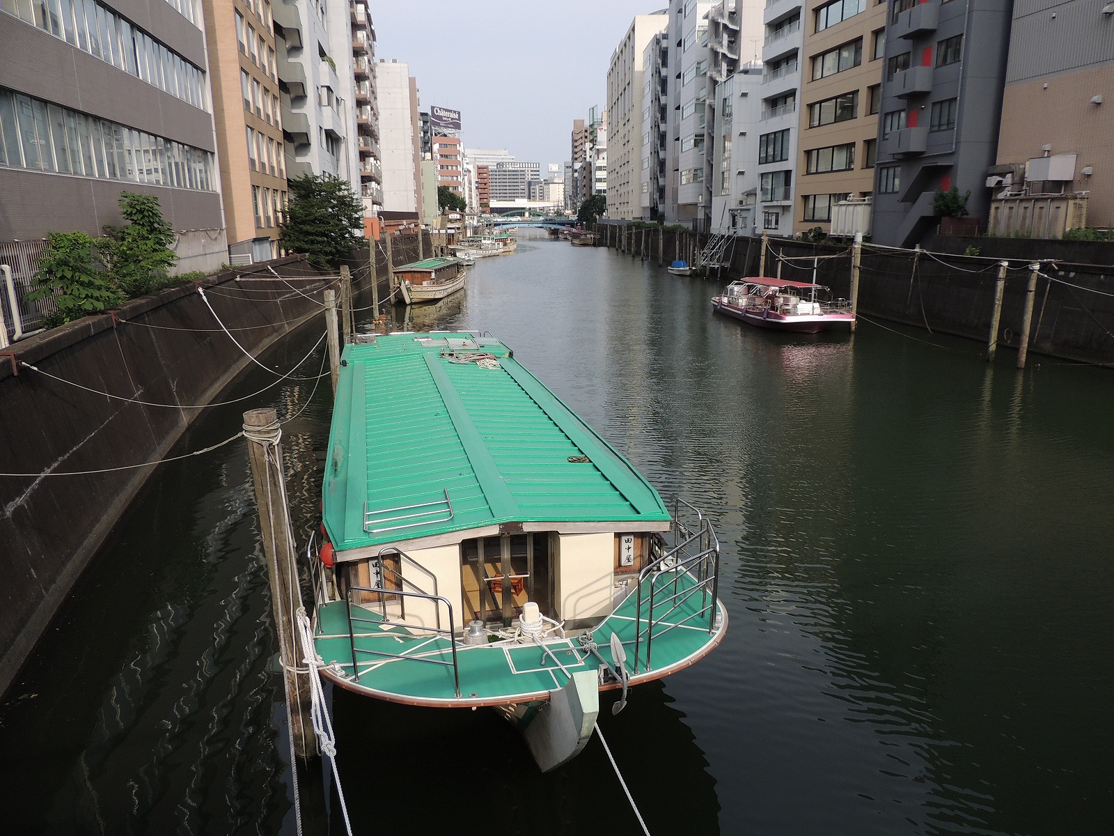 | 「まいばすけっと」でお買い物を楽しんだらすぐ先の「左衛門橋通り」との交差点を左折して、 神田川にかかる「左衛門橋」を渡りつつ宿に向かう。 神田川には屋形船がたくさん係留されていた。 これに乗って、ビイルや天麩羅を呑み喰いしながら、お花見や、隅田川の花火大会なんてのもいいね~。 |