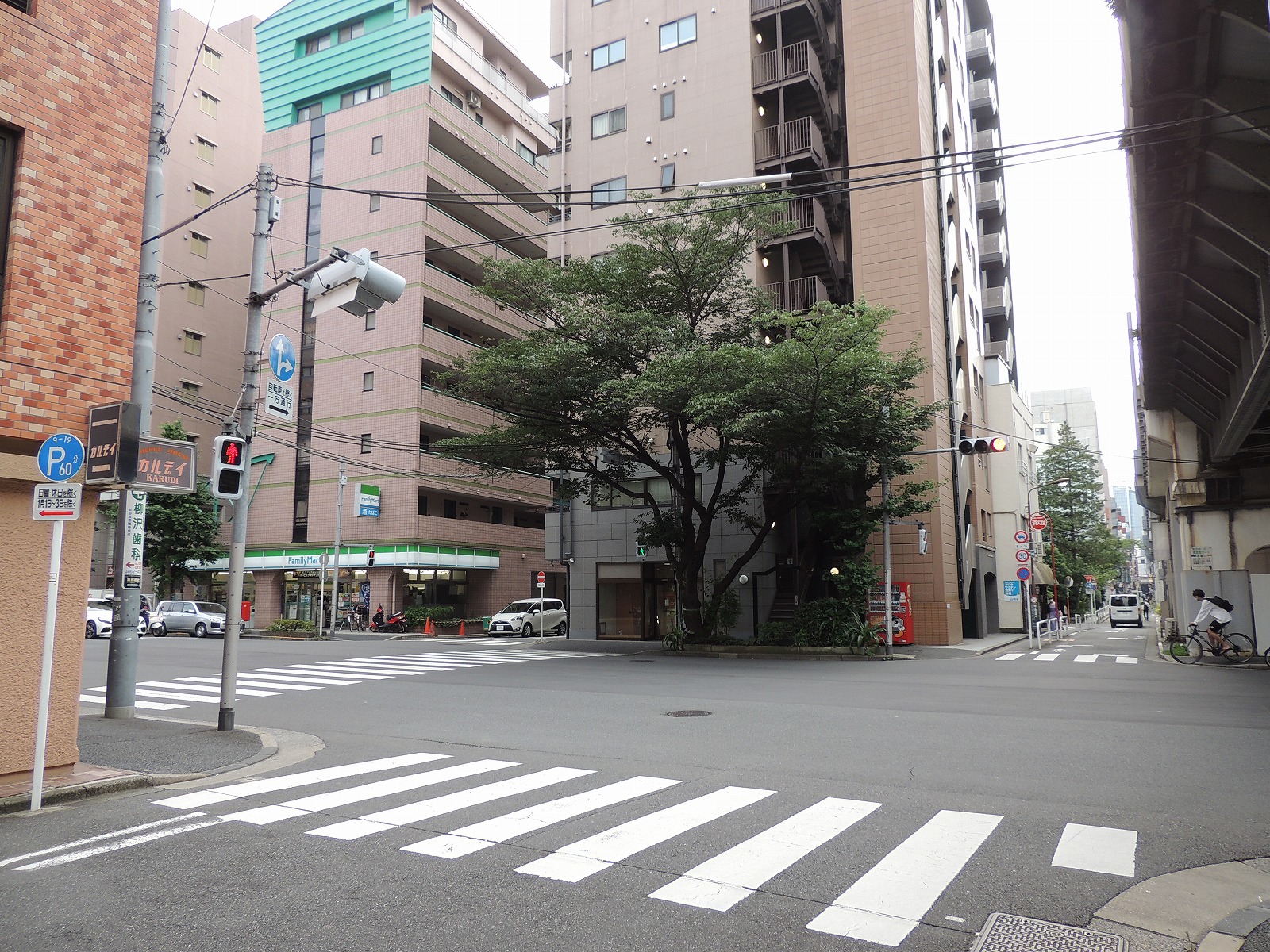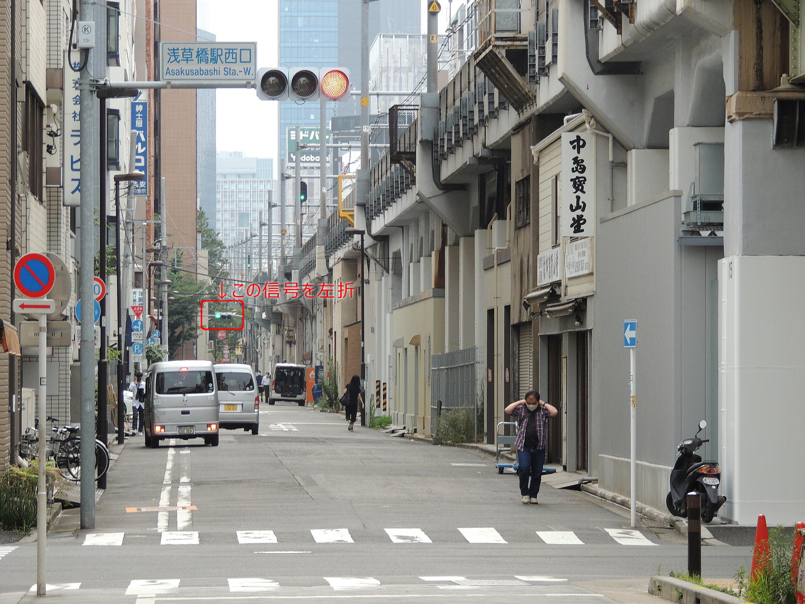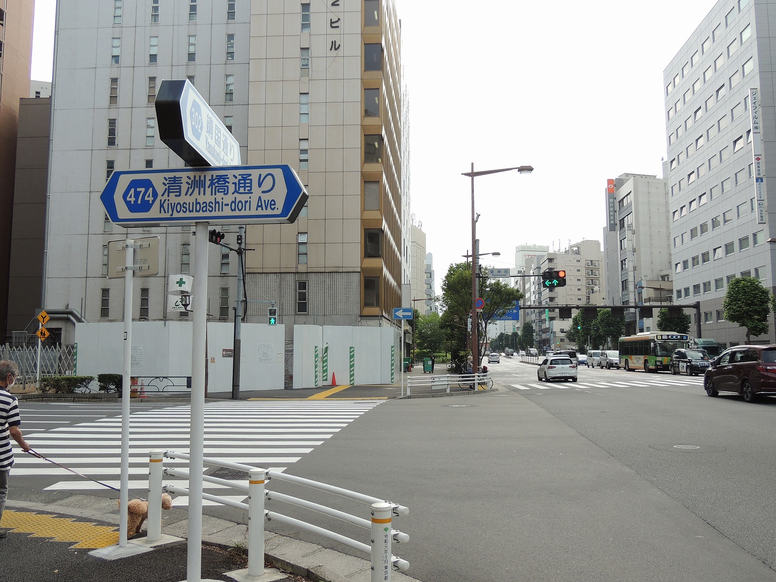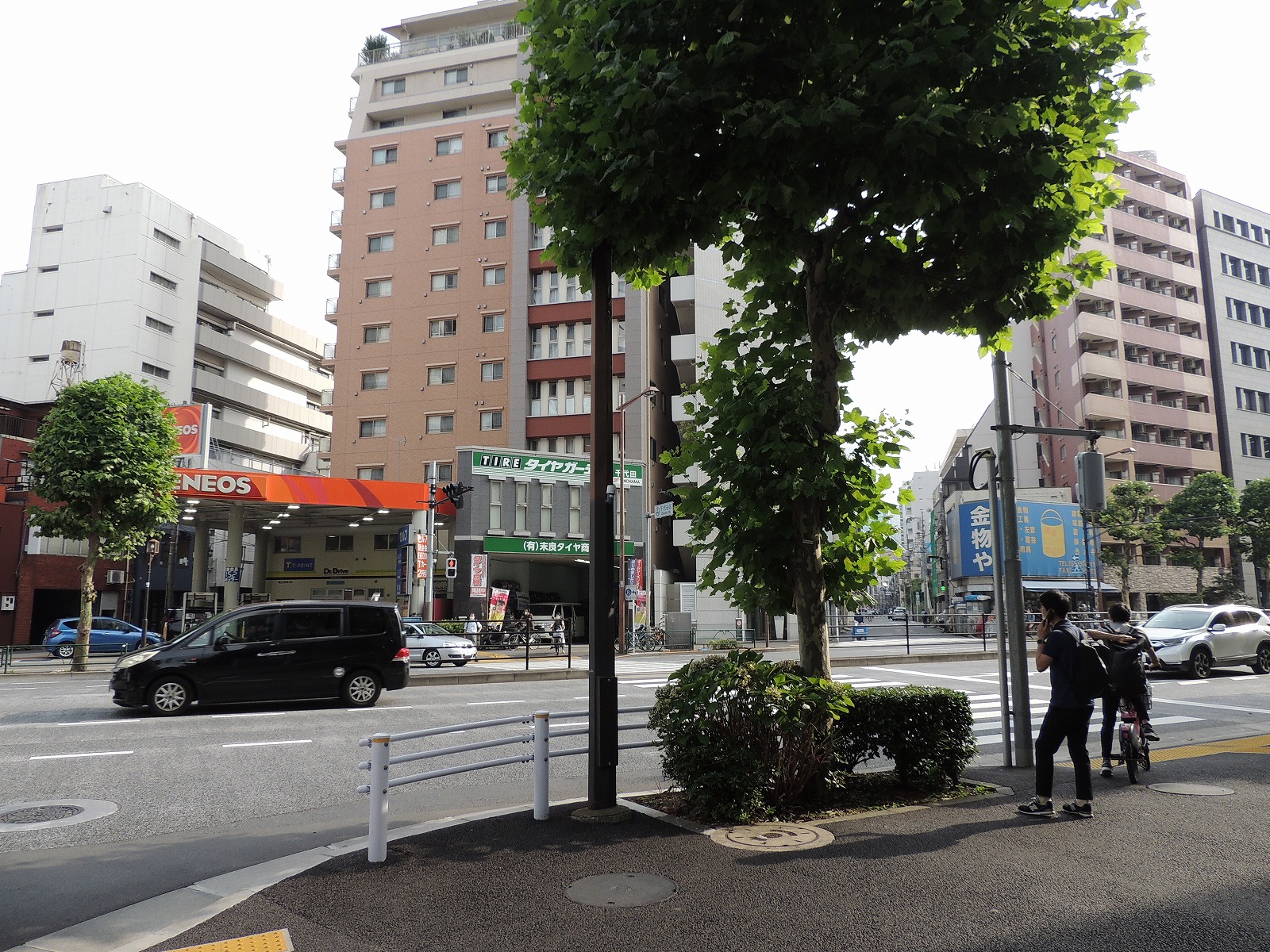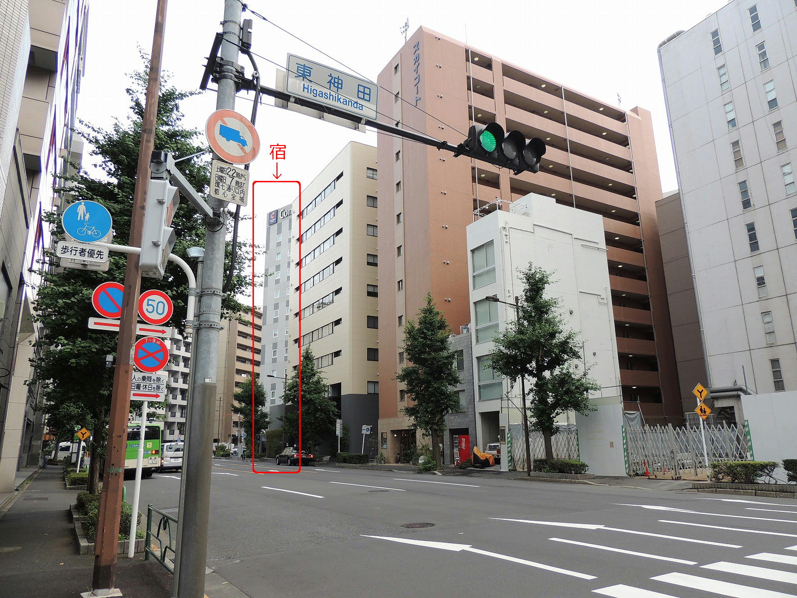 | 「靖国通り」を西へ少し歩いたら、「清洲橋通り」と交差する「東神田」交差点に来た。 この交差点は最初の「1回曲がるだけルート」でも通っているので、ここで左を向くと宿が見える。 |