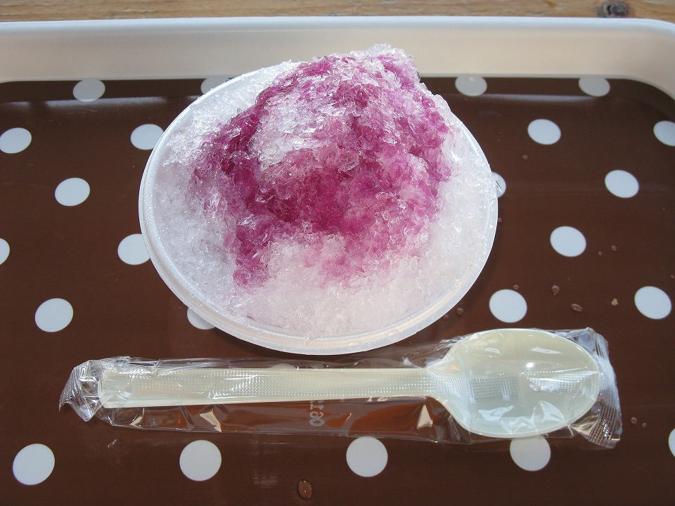 | お店では、サービスでかき氷を出してくれる。 シロップも数種類あり、今回はグレープを選んでみた。 グレープってあんまり見ないよね。 他のダイバーさんには、杏仁豆腐味が人気だった。 俺はギッチョ(自分で言うならいいだろ。)なので、 スプーンの置き方は、こう。 |