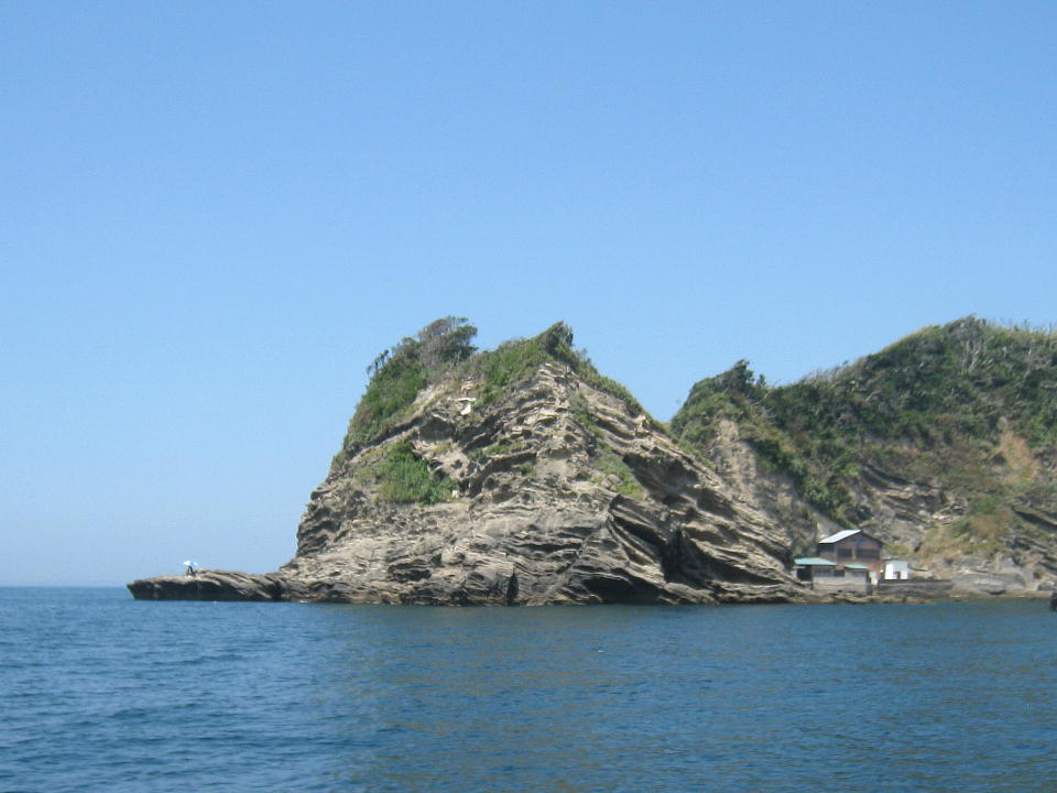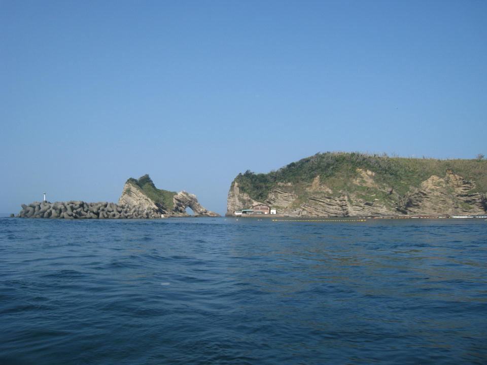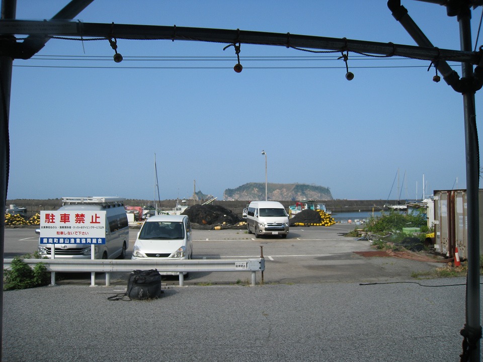| 受付とセッティングを終え、出港時刻まで店のベンチでぼぉ~っと待つ。 今回はシゴトで上京のため、信州から持ってくる器材は最小限にとどめた。 大きいモノはレギュレターの一式のみぐらいで、あとはレンタルする。 早朝は心配になるほど曇っていたが、晴れてきた。よかった。 ここのベンチの上には屋根があるので、直射日光は避けられる。 写真に写っている1BOXカーの向こうに見えるのが無人島の「浮島(うきしま)」。 ダイビングポイントはこの島の周辺だ。 |