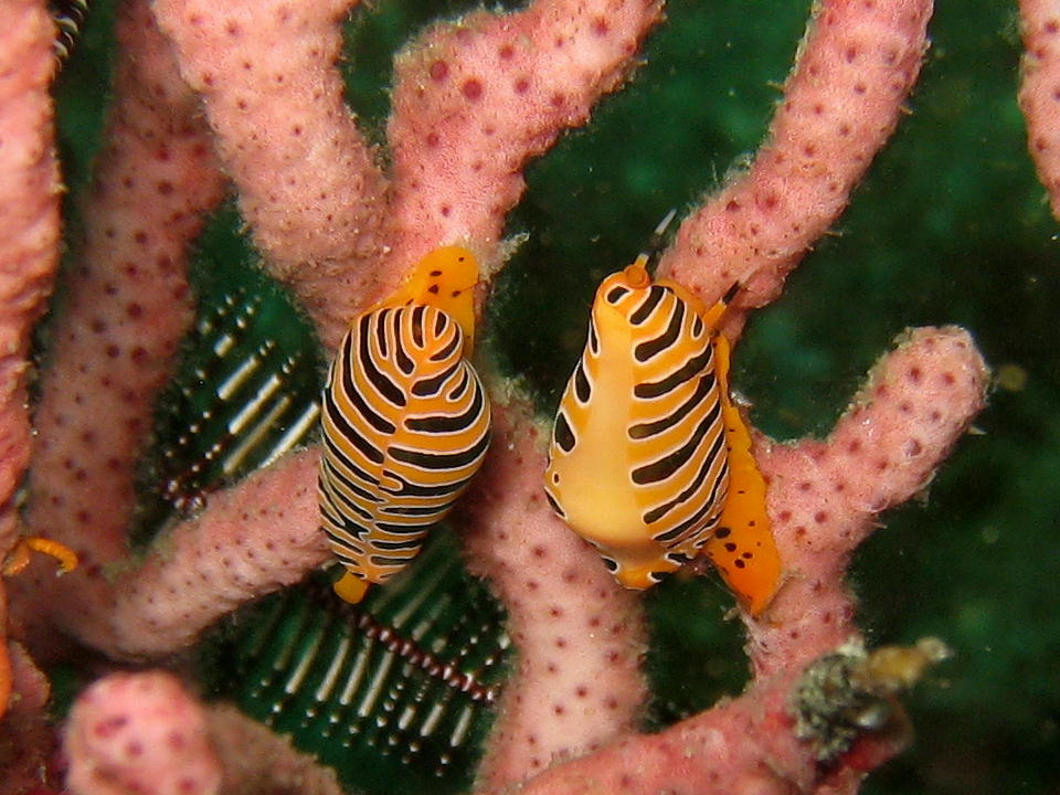 | 鮮やかなタイガースカラーのトラフケブリ。 左の個体は外套膜を貝殻の頂上まで出している。 右の個体はまだ途中まで。 もっと真横から撮ればよかったな。 |