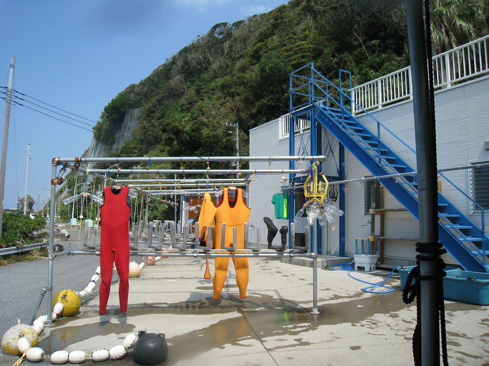 | 04:29に起きて、宿の直近のJR総武本線馬喰町(ばくろちょう)駅から朝二の総武快速に乗り、 木更津で内房線の鈍行に乗り継いで、8時前に安房勝山駅に着いた。 迎えに来てくれていたクルマに乗り、数分で今回お世話になる「かっちゃまダイビングサービス」に到着~。 なかなかの大店だ。 「かっちゃま」は、かつやまのこと。地元ではこう呼ぶらしい。 長岡を「なごーか」、静岡を「しぞーか」というようなもんか。 |