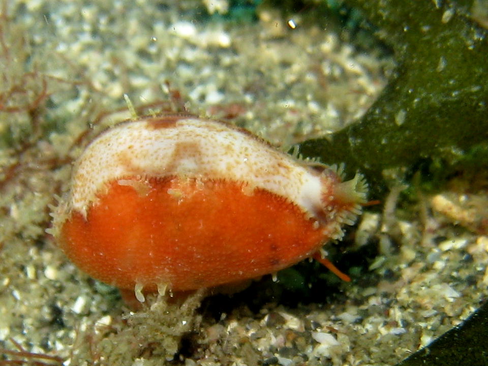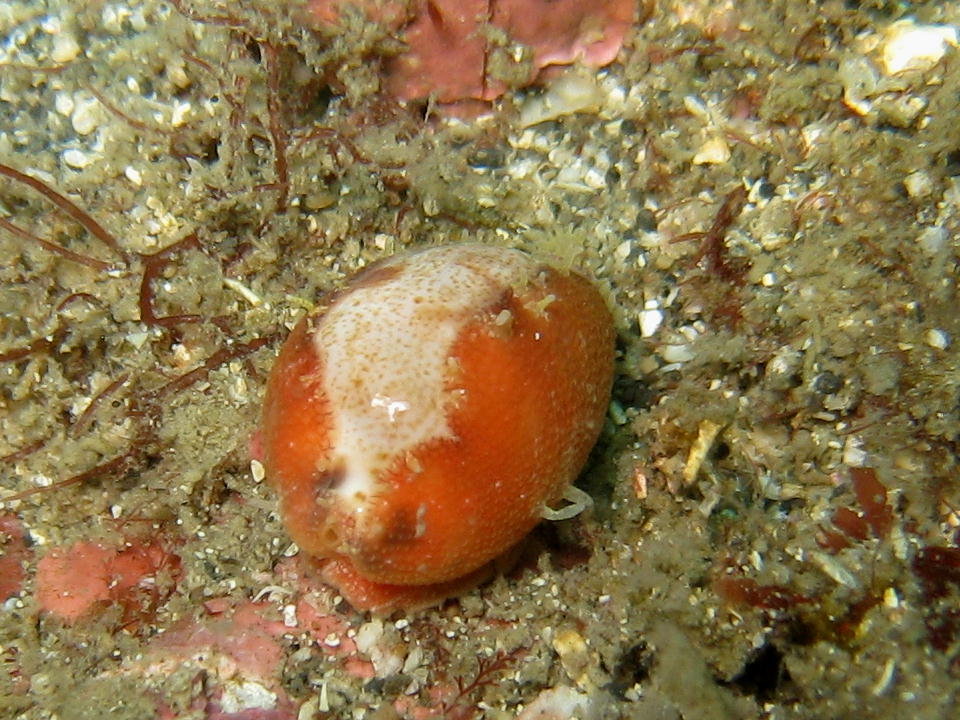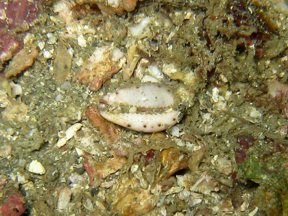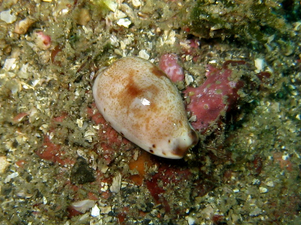 | 写真右の、マンガのタコの口のような水管がぴょこっと出てる方が頭側。 間違える人が多いが、タカラガイの仲間は、貝殻が細い方がアタマだからね。 この写真でも、右に赤い触覚が出てるでしょ。 この個体は当然右に移動しているんだが、これが意外と速い。 ウミウシ類よりは速い気がする。 ウミウシだと撮りたい向きに置いたらしばらくはそのままで、 そのうちのそ~っと動き始めるけど、 タカラガイは置いてすぐ向きを変えたりしてつつつ~っと動き始めるから 撮影が結構難しかったりするんだよね。 コイツを動画で撮ればよかったな、アトで気付きました。 写真のピントが甘いのはご勘弁。 トリミング(原版からの切り出し。)はしてるけど、拡大はしてないよ。 |