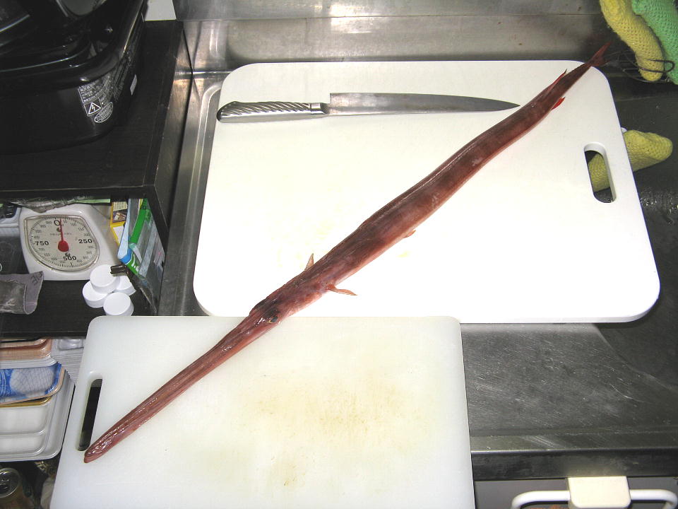 | 今日は職場でイヤなことがあったので海の幸が喰いたくなった(なんでだ?。)。 今晩は、 旬じゃないけど、角上魚類で僅か200円で売っている 俺のお気に入りの石巻のホヤ刺しでも肴にしてちびちび呑むベぇか、 と仕事帰りにクルマで行ってみたら、 高級魚とされているアカヤガラ(富山産)を、500円ナリで売っていた。 ちょっと前に「ダーウィンが来た」という番組でヘラヤガラを取り上げていて、 職場のダイバー仲間から「角上でたまに売ってることがあるよ」を教えてもらっていた。 今日はちょうどそのタイミングだったんだね(ヘラとアカの違いはあるけど、それは置いといてと。)。 なので、ホヤもアカヤガラもGETしてきのよ。 アカヤガラはダイビングしてると時々見かけるけど、食用として買うことになるとは思わなかったよ。 しっかしまあ、細長い魚だね…。ここまで細長くなる必要はなんだったんだろう??? 捌くにあたって久々に大きいまな板も出したよ(笑)。 でも、どうやって捌きゃいいんだ? 全く初めてなので、とりあえずネットの動画で予習する。 あ、長さを測るの忘れた…。50cmぐらいかな~。 動画での予習のお陰で、特に苦労することはなく捌けたよ。ありがたいもんだね。 ただ、この個体は、小魚をたらふく食った直後に漁獲されたらしく、 食道から胃にかけて、未消化の小魚がパンパンに詰まっていて、ちょっと臭いを発していた。 これらは丁寧に処理したよ。 |