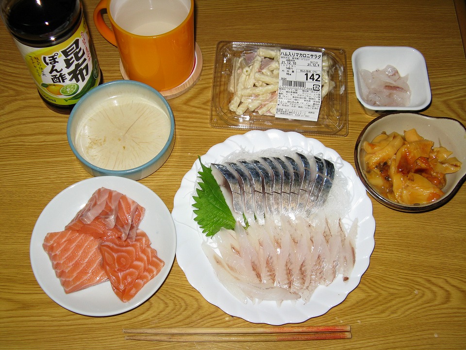 | さて~、呑みながらのアカヤガラやその他のお魚の楽しい捌きも終わり、 いよいよ呑み助ランランラン♪(もう呑んでるだろっ。) 今回のアカヤガラの捌きは記録(=撮影)していないので、 興味のある方はネットで他の方による動画を漁ってね~。 アカヤガラは図体が長くて細いので、身の部分は少なかったね。 中ボネはだいぶ硬かった。ということはいい出汁が取れる予感がするよ。 この写真でのアカヤガラの刺身は、この写真真ん中下の、〆鯖の下の部分。 ネットでの情報では、歯ごたえがとてもいいってんで期待してたんだけど、 この個体は特にそういうことはなく(もちろんまずいっていうことではないよ。)、 スーパーで売ってるメバルなんかのレベルってとこかな~。 写真左上から時計回りに、 ・昆布ぽん酢と酒(あ、この2つはど~でもい~ですね) ・個人的に大好きなハムマカロニサラダ(値段が分かるようにワザとフタしたまま。) ・アカヤガラの切り落とし(「家庭」なので、いい部分のアカヤガラの刺身と一緒に盛り付けてもいいんだけど、やっぱ分けたくてね。) ・石巻のホヤ刺し(旬ではないけど好きなのだよ。) ・〆鯖刺し(既製品)。時間があれば丸のマサバから浅〆で作りたいとこだけど…。 ・今回の一応の主役、富山産のアカヤガラ ・ノルウェー産のオーロラサーモン(俺はチリのよりノルウェーの方がプルプルしてて好き。) サーモン刺しの上の小皿は、なぜかうちにある「吉野家」のお新香の旧タイプの皿。 昆布ぽん酢を注いでから写真を撮ればよかった…。皿の劣化がバレるぅ。 |