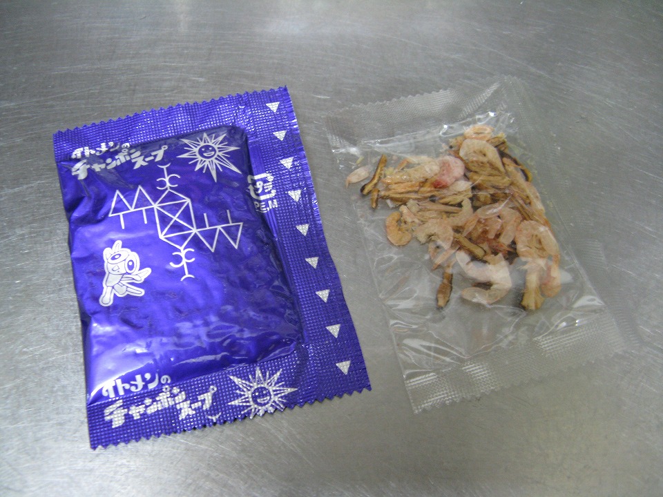 | 干し海老と干し椎茸のかやくが、単独の袋に収められている。 この写真はストロボを炊かなかったので、 じつはビミョーにブレている(苦笑)。 |