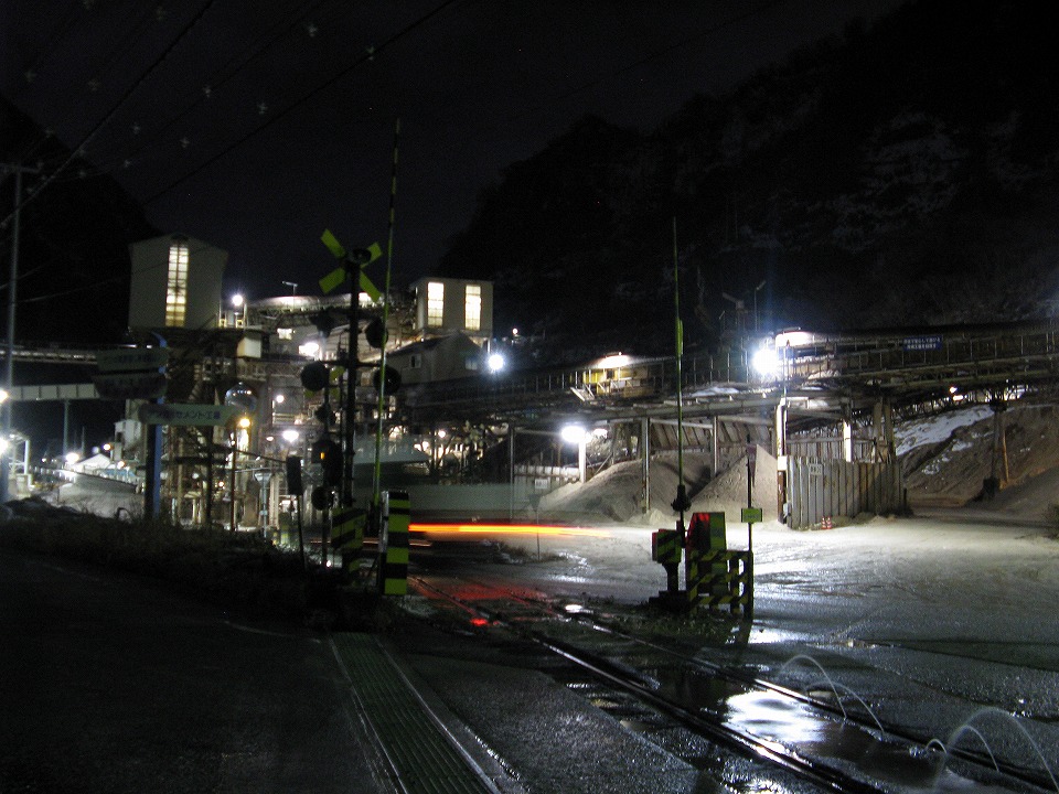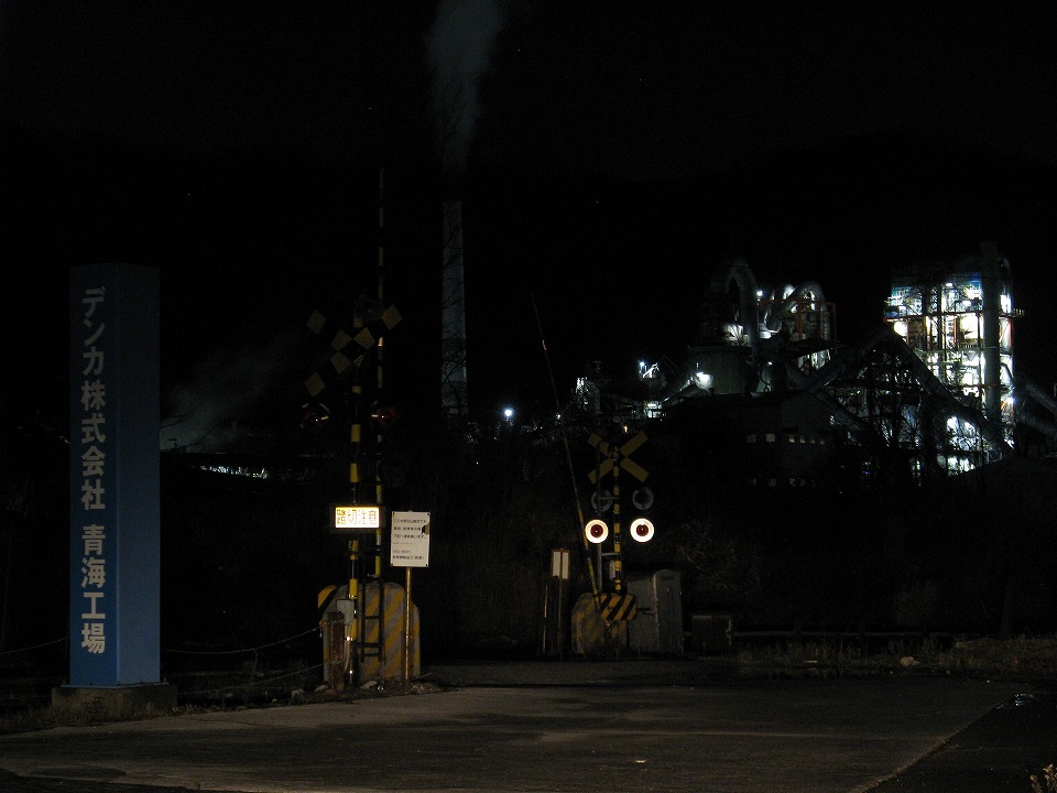 | 糸魚川市内を通り過ぎ、デンカ青海工場の踏切に来てみた。 明日の朝、ここで原石線を撮影する。 工場は稼働しているように見え、 工場萌えにはハァハァできるかどうか分からないがそこそこ照明が点き、トラックも動いていた。 |
