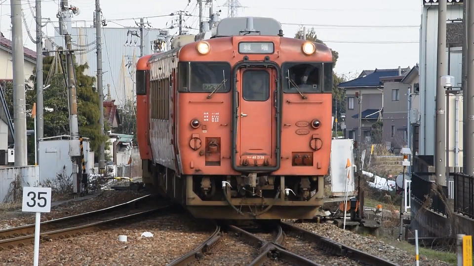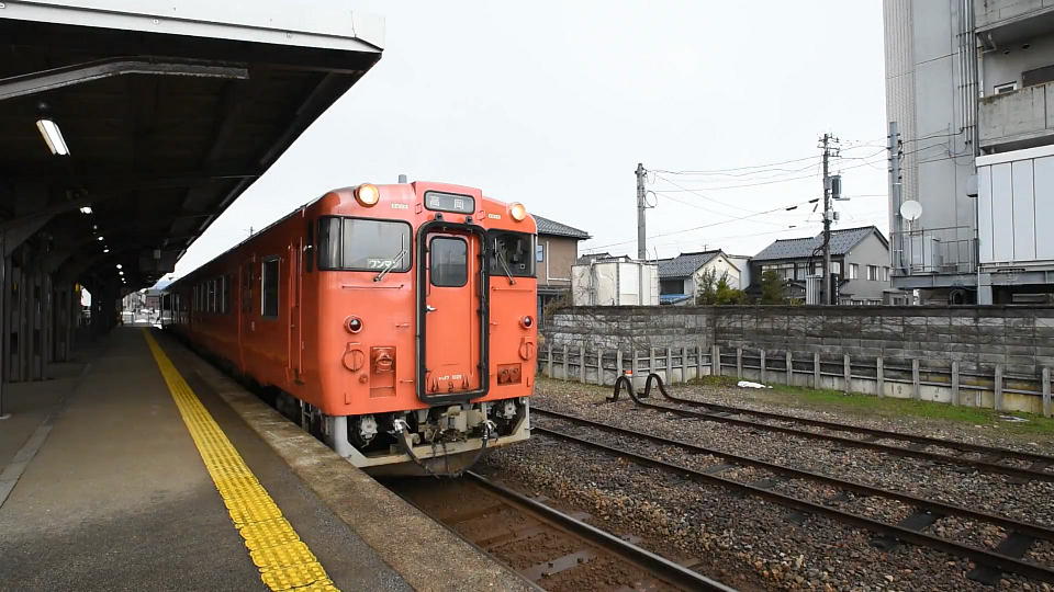 | 氷見うどんと寒ブリで満足して、氷見駅に来たら雨が強まった。 発車シーンを撮影したかったのだが、なんと、ホームの屋根が見事なまでに 列車の端っこと揃っている(つまり列車を前面から撮影しようと思ったら、雨で器材が濡れちまう。)。 この列車の発車ギリギリになって急に雨がほとんど止んだので、 思い切ってアングルを変えてみた。 発車の様子の約31秒の動画はこちら。 |