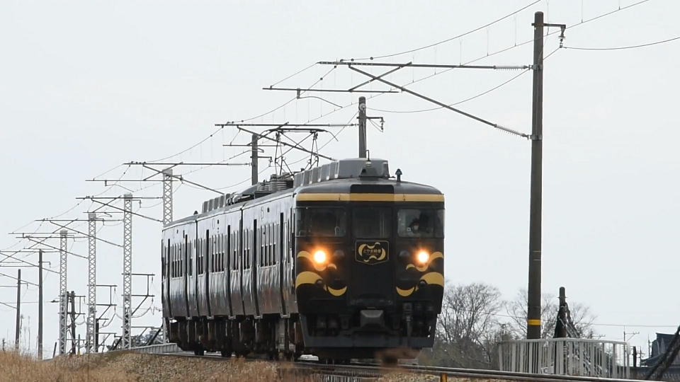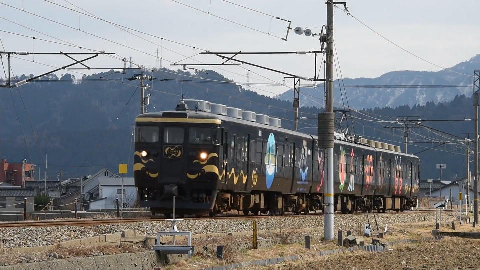 | 残り2編成となった、あいの風とやま鉄道の413系。 せめて青一色の方を期待したが、「色もん」のとやま絵巻編成が来た。 前回は動画からのキャプチャーのみUPしたが、今回は動画もUPしてやる(エラソーに)。 約44秒の動画はこちら。 |