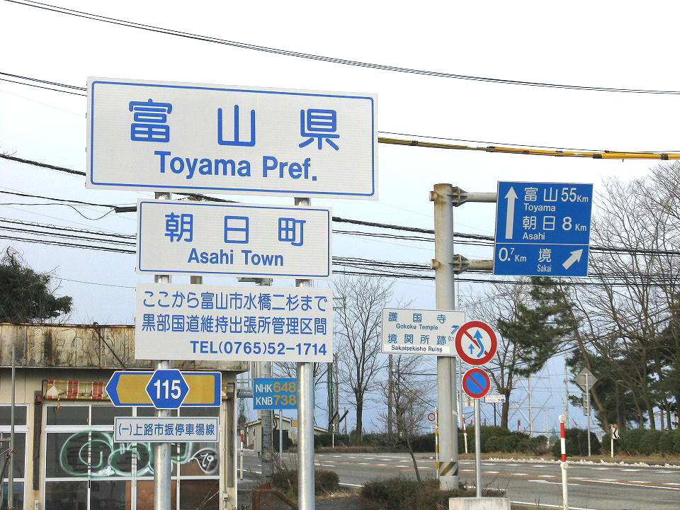 | 市振から境川を渡って富山県に入るよ。 いつもは運転しながらこの表示板を撮影しているが、 今日は表示板のそばまで来て停車して撮影したよ。 |