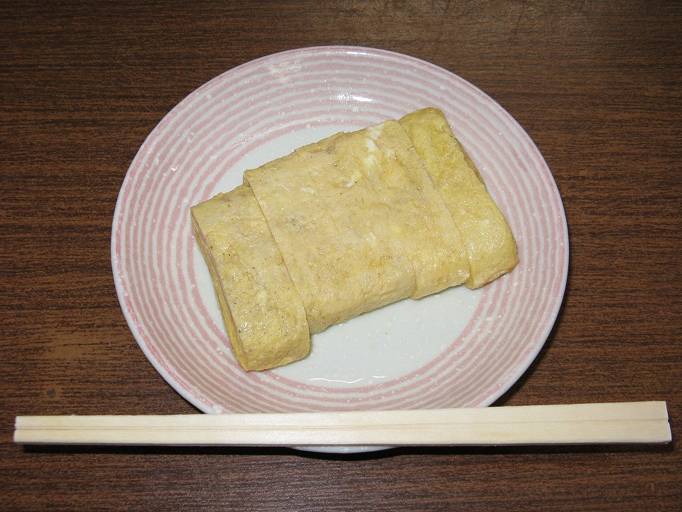 | 大好きな卵焼き450円ナリも、迷った末に注文した。 甘くなくて旨いんだが、ちょっといいお値段なのよね。 |