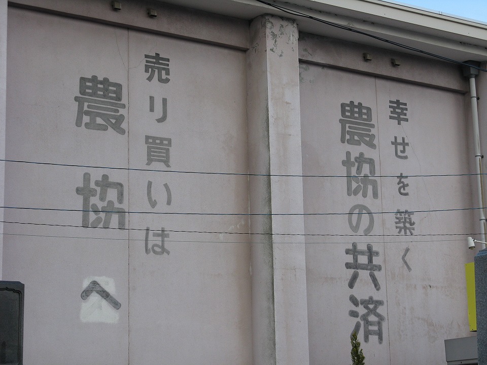 | ・「売り買い」ってなにを? ・「協」の字がシブいぜ。この一部だけを「ン」にする意味は? ・「へ」は「え」のままにしてほしかったな~ ・共済は「幸せを築く」のか~ こういうのはずっと残っていてほしいな。 入善町内の元「入善東農業協同組合農業倉庫」(と読めた)にて。 |