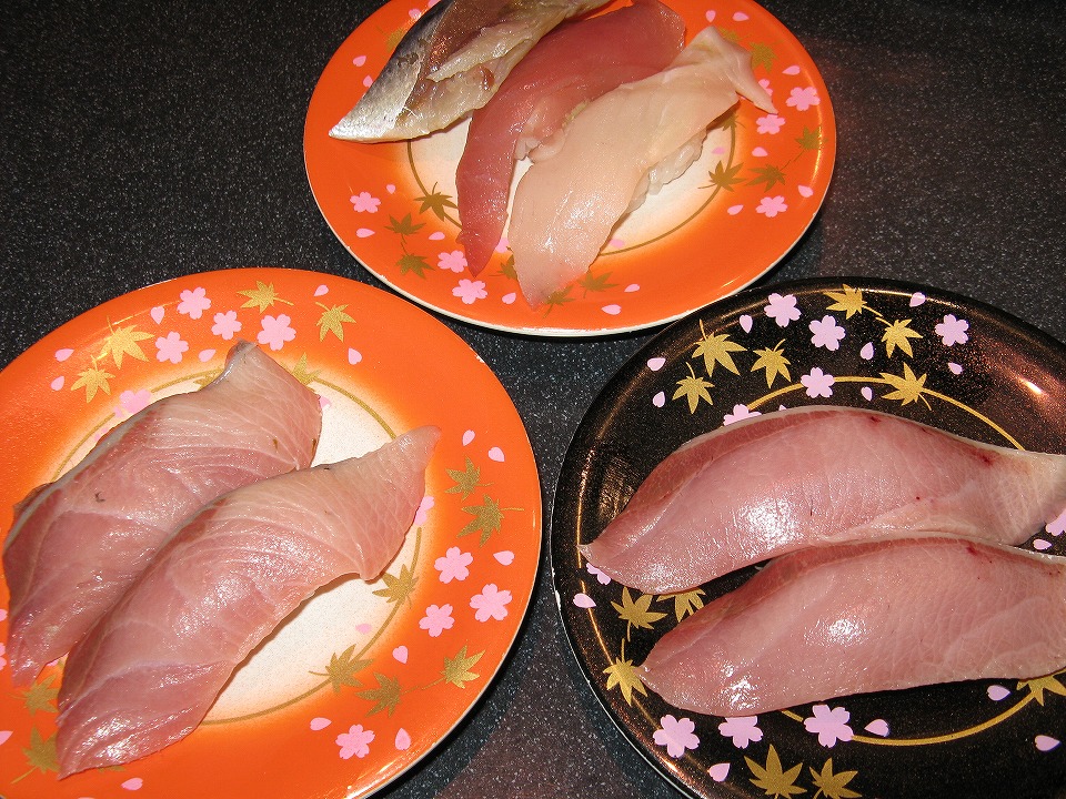 | 道の駅「氷見」にあり、氷見前を謳うその名も「氷見前寿し」にやってきた。 目当ての氷見の寒ブリを食す(ブランド扱いの「ひみ寒ぶり」とは違うからね。)。 俺は寒ブリに目がない。 富山湾~佐渡沖~秋田沖で獲れる10kg超のヤツの刺身なんざ、たまりませんね。 10kg超といえば、氷見市内の道の駅やスーパーで1本まるごとデン!と売っていて、 5万だ、7万だという値段が付いてたけど、買うヤツなんているのかな(笑)。 写真は、 中央上が光り物3種528円ナリ。 手前左が、ブリ528円ナリ。手前右がブリトロ638円ナリ。 光り物3種は、注文を間違えて握ったと思うが、 元々おまけで頼んだようなものだったから何も言わなかったよ。 |