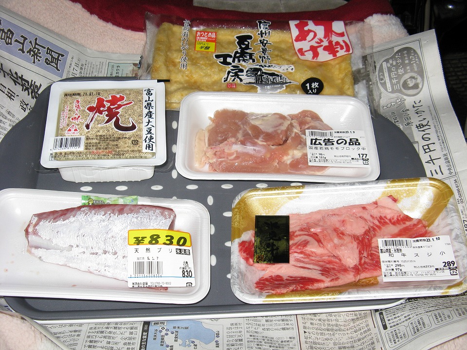 | これらが今日の車ンプの食材。 牛肉のラップに「氷見牛」のシールが貼ってあるんだけど、よく写っていなかったね。 |