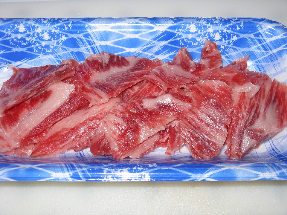 | 氷見牛のスジ肉から、赤身の部分を丁寧にこそげる。 ちょっと見は、サシがそこそこ入ったよさげな感じでしょ。 |