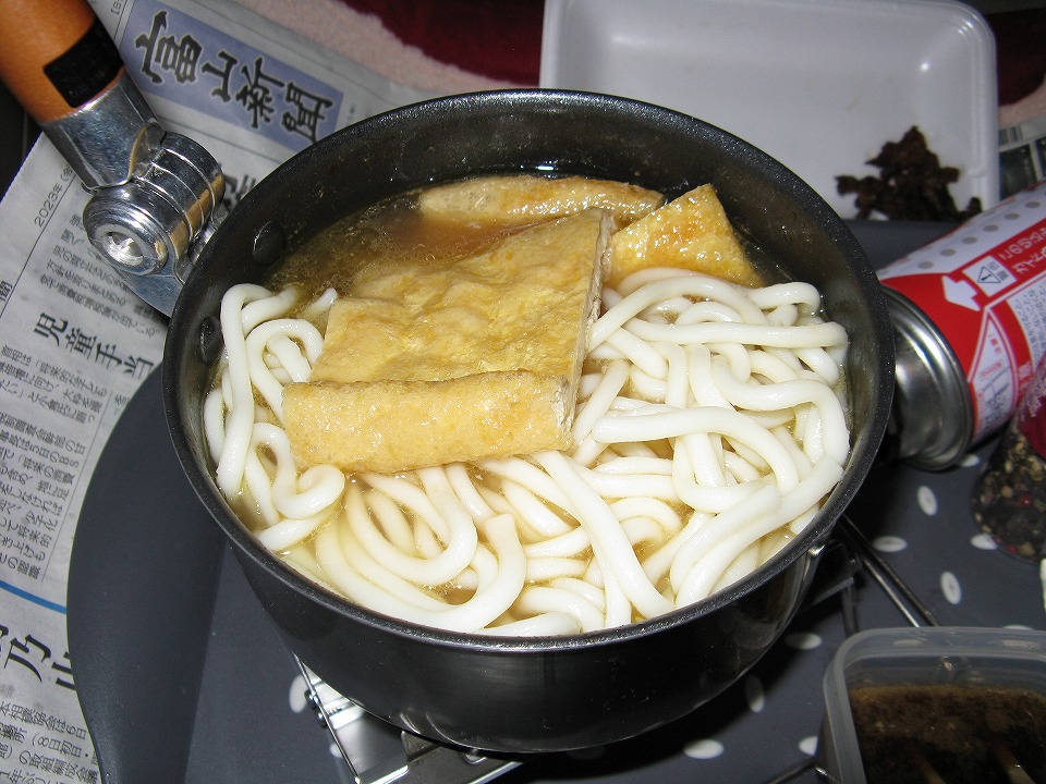 | 〆はきつねうどん。 このうどんは氷見うどんじゃなく、ただの茹でうどん(笑)。 鍋の底には鶏肉も控えている。 豆腐は結局喰わずに、信州まで持って帰ってきた。 酔いも回って、ハラ一杯になって、21時過ぎにはもう沈没してしもた。 |