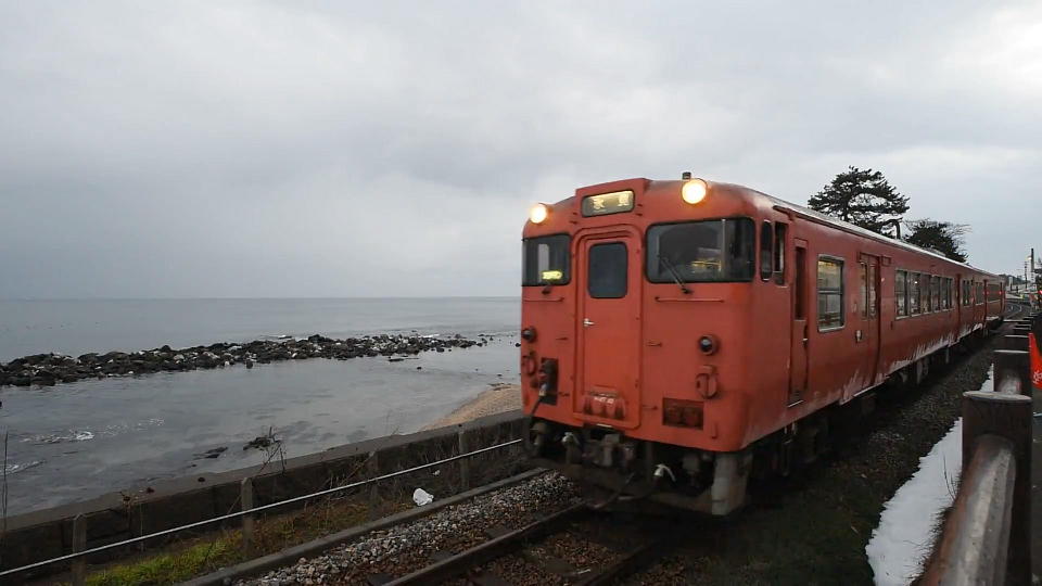 | おはようございました…はいいけど、朝から雨だよぉ。 この時期の日本海側だからしょうがないけどさ。 お天気は悪くても撮影はするよ。 まずは、まさに"鉛色"の日本海の横を通る氷見線から。 道の駅「雨晴」の前で撮影した約26秒の動画はこちら。 今後ここで、青い海のバックに雪をいただいた立山連峰と一緒に撮影したいね。 今回は真冬の風景ということで。 |