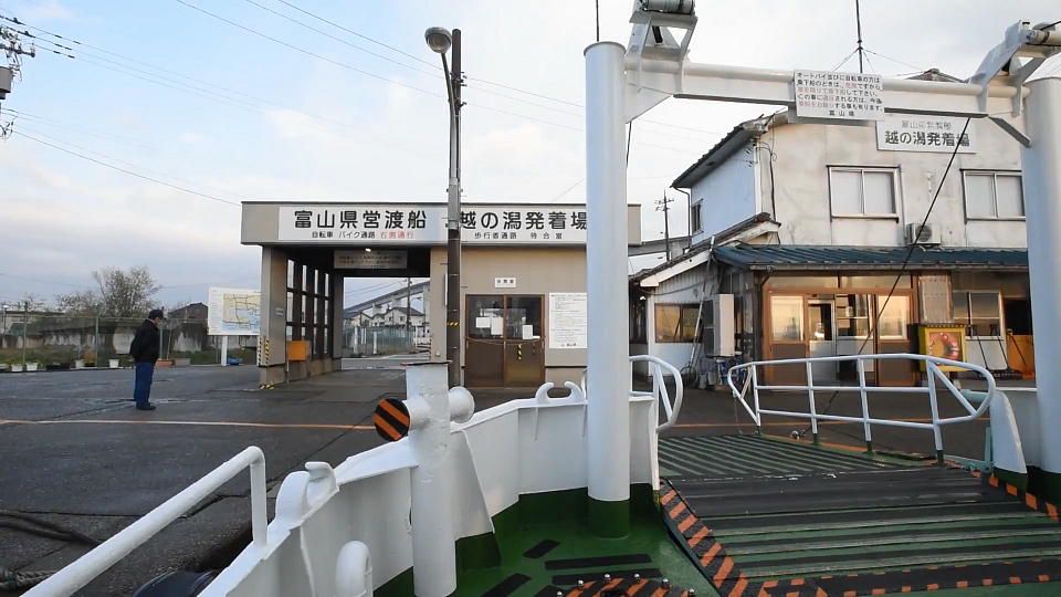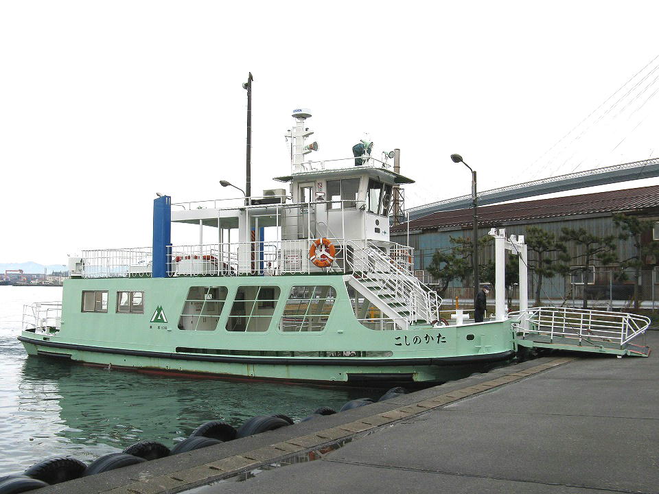 | この船が、俺が慌てて乗船した「こしのかた」48t。 1987(昭和62)年就航の35年選手。 この写真は、越の潟の対岸の堀岡に着いたときに撮影。 んで、この船が何かというと、「富山県営渡船」なんだね。 運賃はなんと無料! 「県営渡船」は俺がネットで確認した限り、全国で3か所(富山、高知、愛知)にしか残っていない。 どこも無料のようだった。 この「富山県営渡船」について、詳しくはググってね。 |
