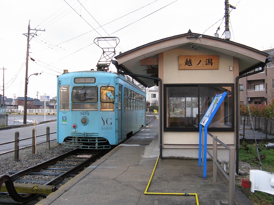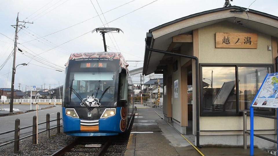 | 「こしのかた」の撮影後は越ノ潟駅でデ7070型を待っていたのだが、 MLRV1005が到着した…。 一応撮影した約40秒の動画はこちら。 |