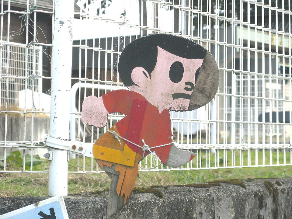 | コンビニにサンドイッチとおむすびを買いに行く途中で見つけた、通称「飛び出し坊や」。 事故にでも遭ったのか、顔はえぐられ、片手と足はちぎれていた(笑)。 今、コイツのグッズが出回ってるよね。 |