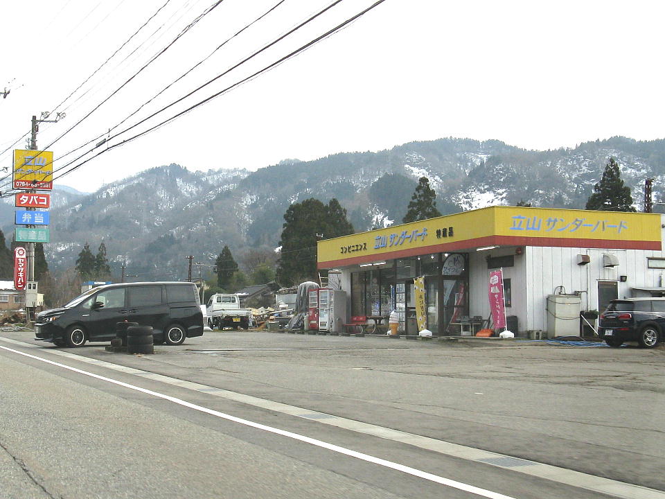 | さ~さ~、サンドイッチとおむすびを買いにコンビニに来たよ。 「立山サンダーバード」にね。 前っから来たかったんだ~。 |
